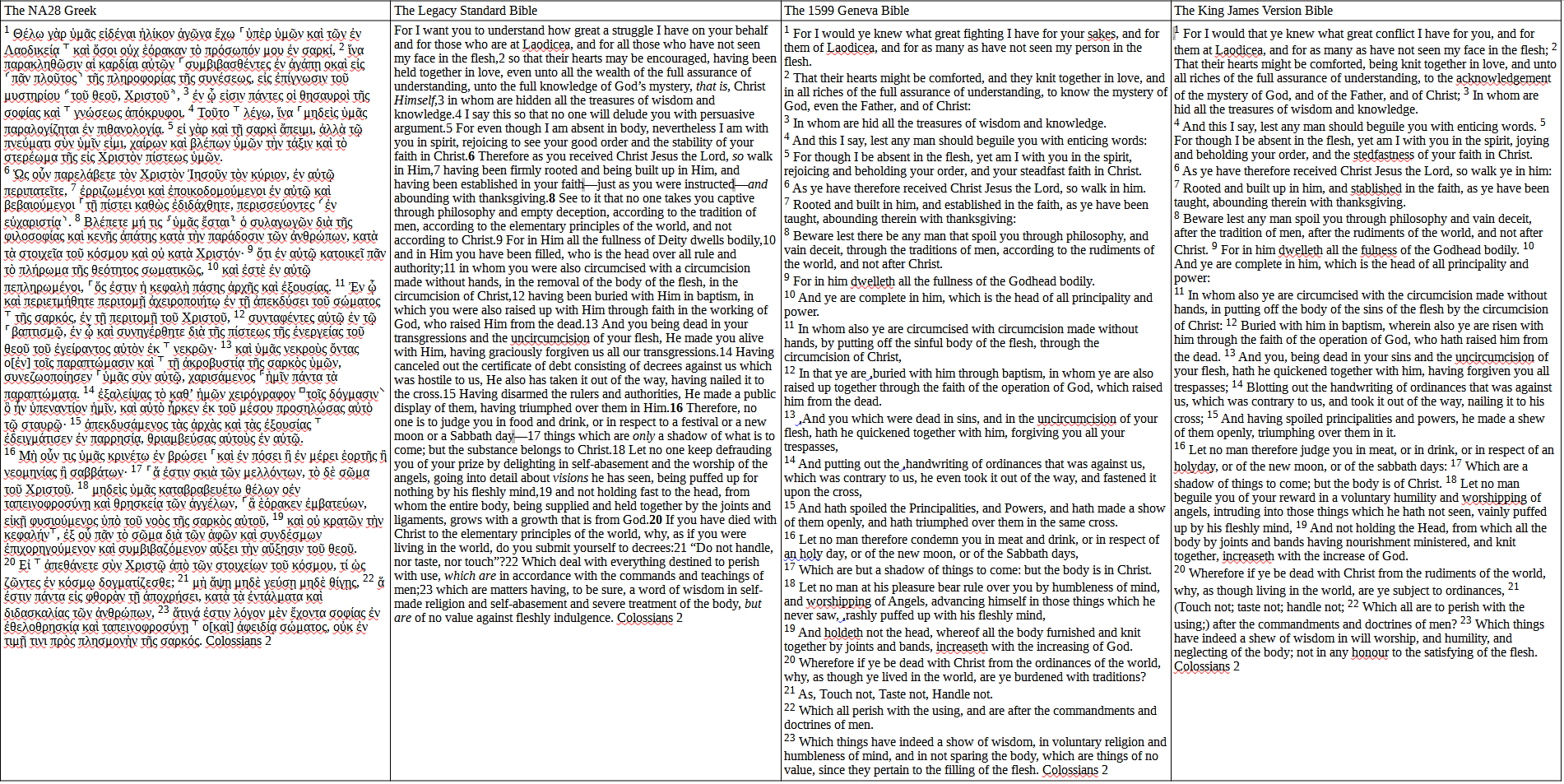 A side by side comparison of four translations of Colossians 2.