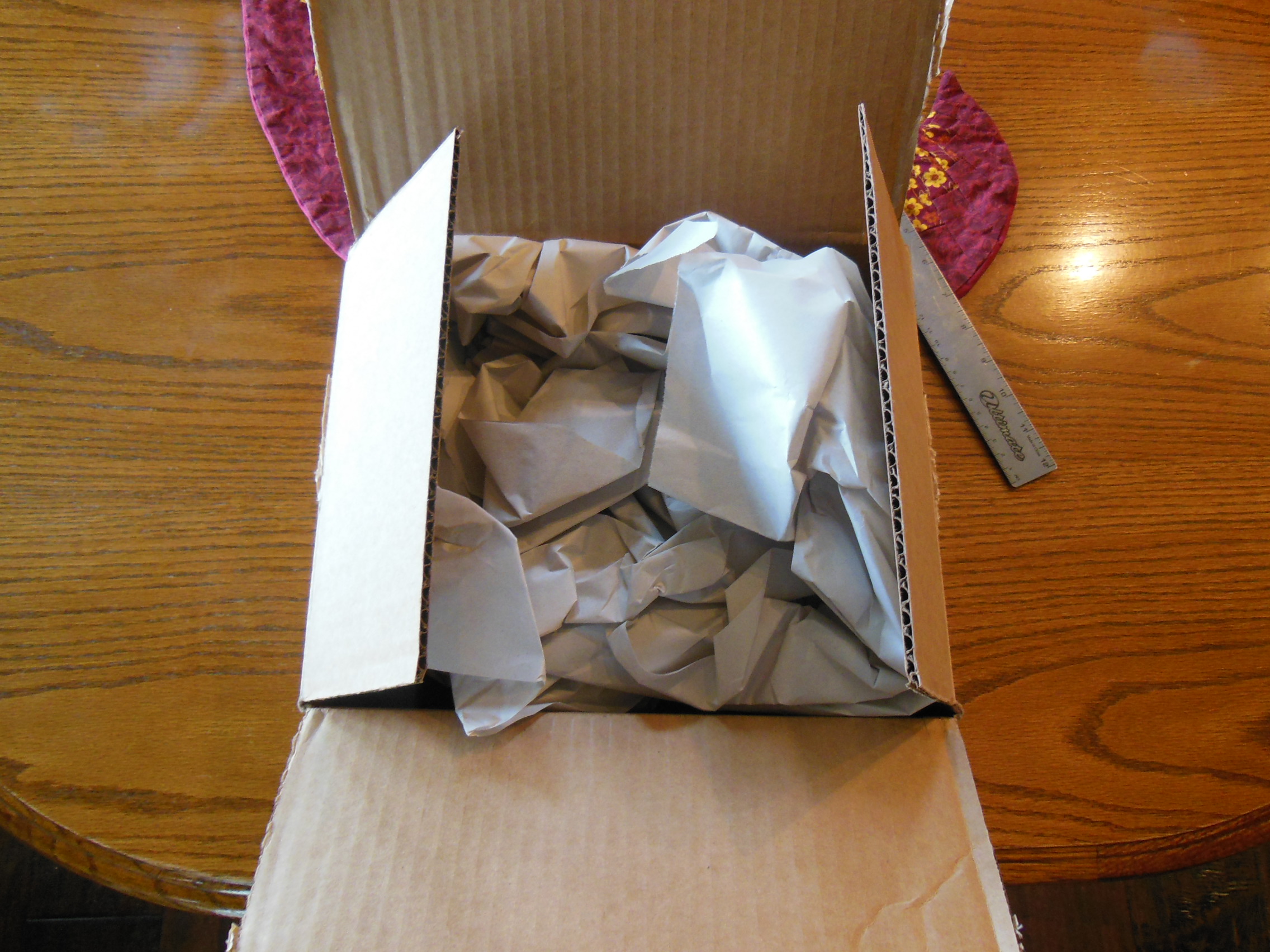 The Bible was shipped in a cardboard box and padded with paper. The paper was all at one corner and the Bible was at the opposite corner.