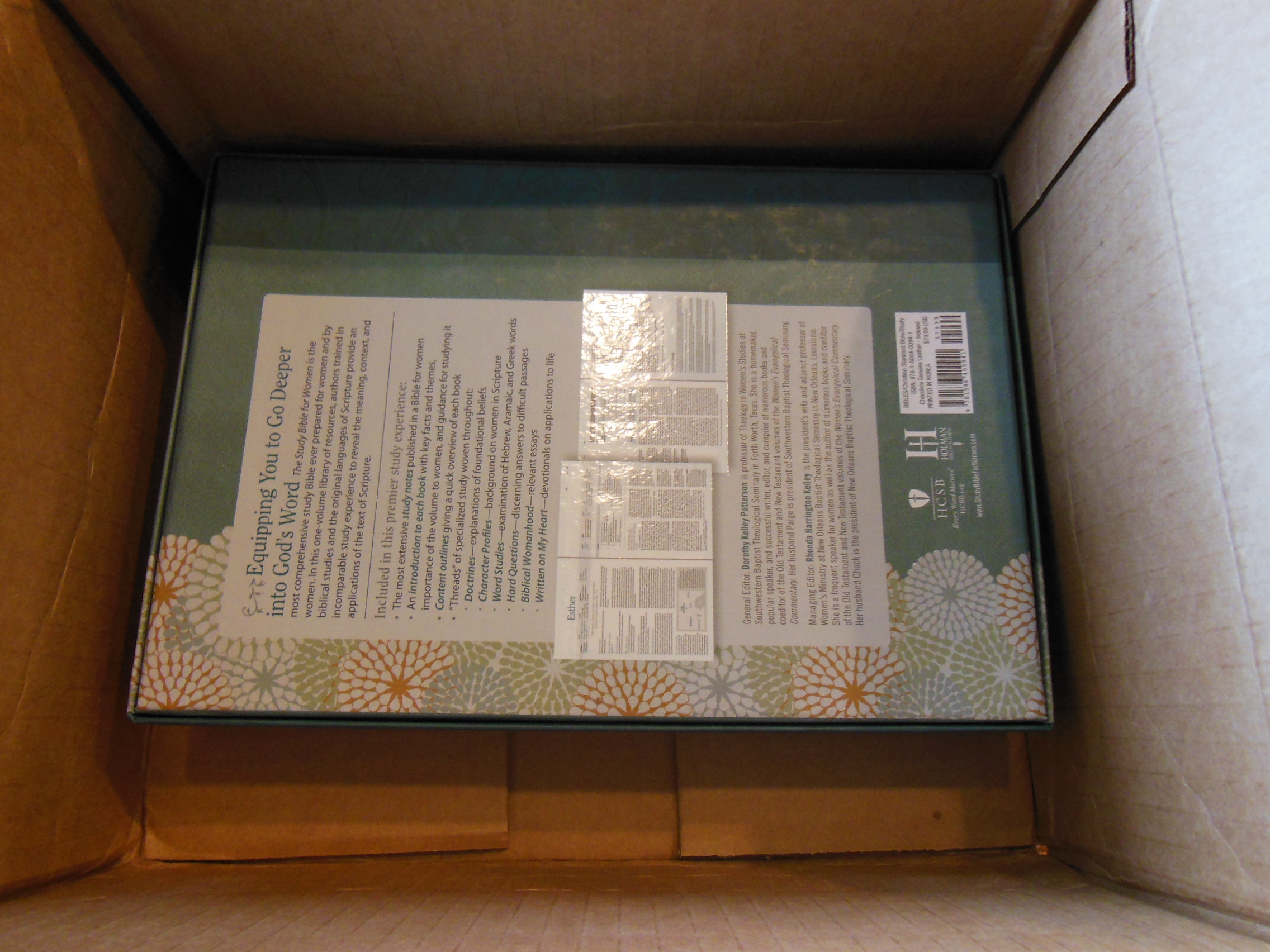 I was in a retail sleeve instead of a box. It arrived with some damage to the spine towards the bottom and back of the Bible. I think this was incurred during shipping. I don’t believe it was Holman’s fault. If I had purchased this Bible and it arrived damaged the retailer or Holman would have replaced it under warranty. Due to the damage I was able to see that the maps are held to each other with binding tape as well as being sewn into the binding. This will make for a very sturdy Bible. Frankly, as good as this thing is built, I’m surprised it got damaged at all. It must have taken a pretty hard bump. The retail sleeve type packaging had all of the expected information on it.