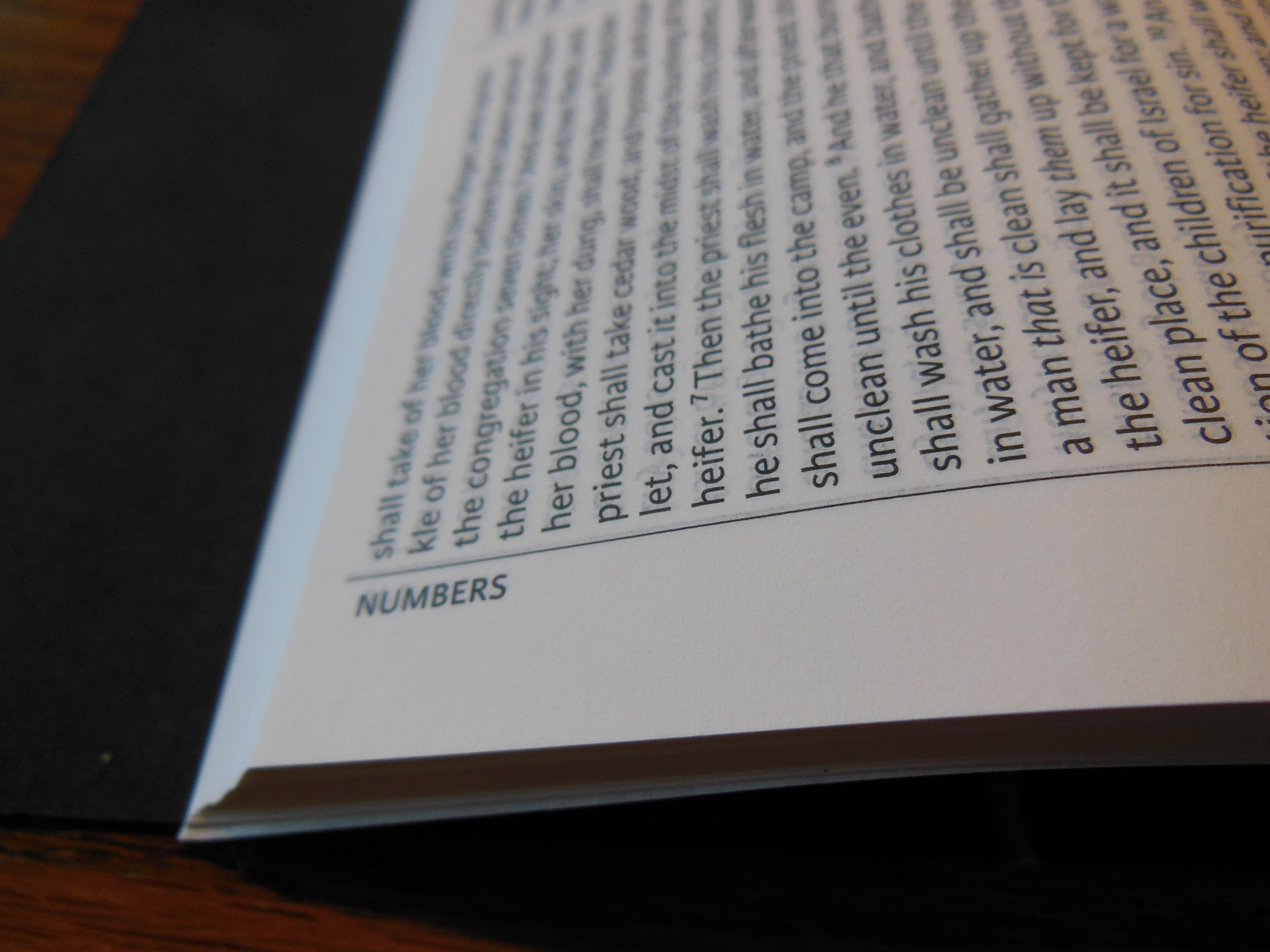 When I took this Bible out of the box and first held it I was concerned that it was too wide. That was my first impression. I failed to take into consideration the purpose of this Bible. I put the Wide Margin next to my MacArthur Study Bible and was a bit shocked to see that it was only very slightly wider. This type of Bible is meant to be written in. Its natural habitat should be a well-lit desk or table. The type of work that is going to be needed to complete the endeavor the owner of this Bible has embarked on will take many several hour sessions of focused study and notation. I don’t see that happening from one’s easy chair. No, a task this daunting requires a quiet well lit sanctuary alone with God’s word. Picture a monk hunched over, with quill in hand, doing a scribe’s work by candle light in some cold stony abbey, or perhaps his modern counterpart the scholarly theologian, at some stuffy seminary quartered away in an office, in much the same fashion as the monk, only with better lighting, heating, and cooling. Well, that might be how you would see yourself using this Bible for its intended purpose if you were so bold.