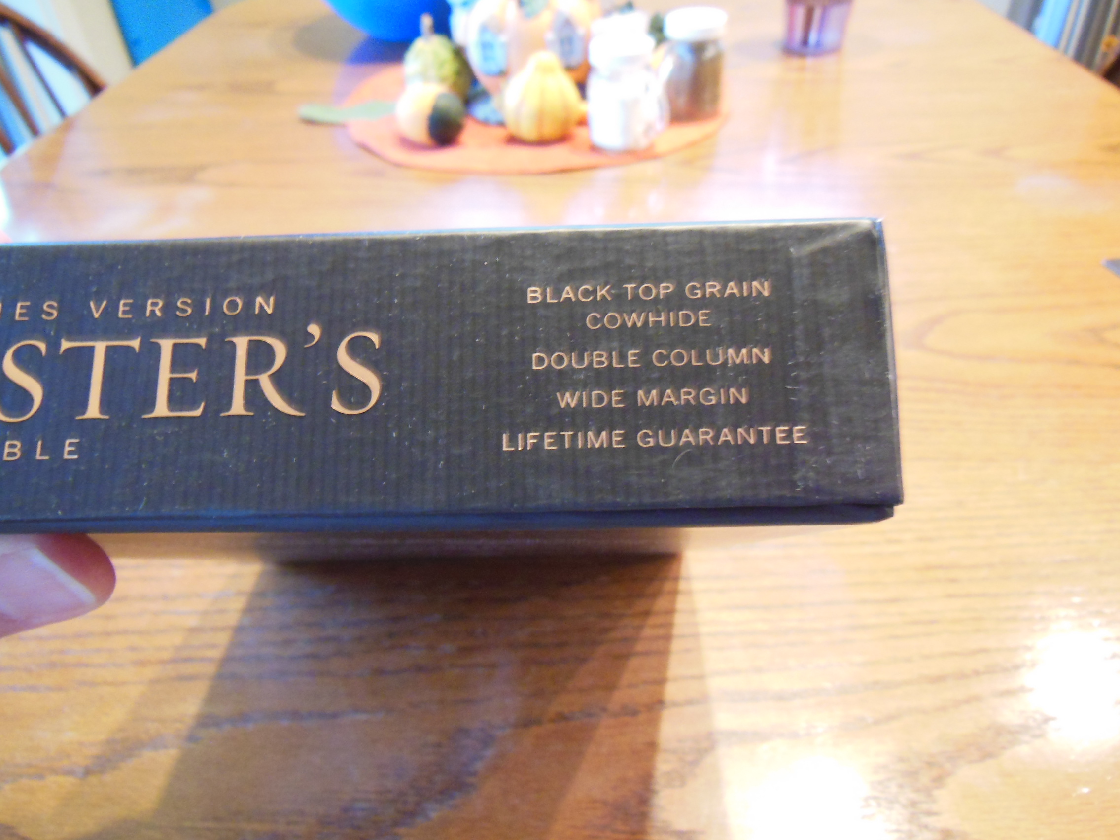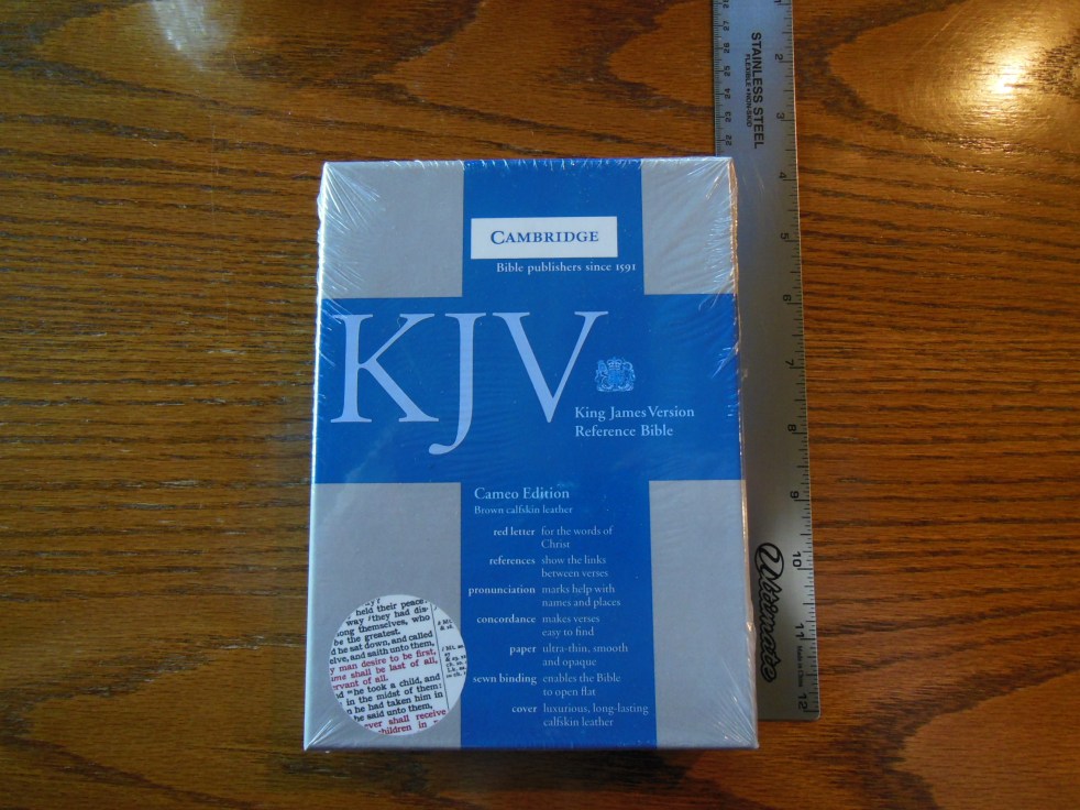 After removing the plastic wrap from the slipcase, I could take the Bible out. It is not a large Bible and it is not as small as a typical compact Bible. It is a full KJV Bible and it does have the Cambridge Concord cross references. It is just a very handy size. It measures about 4 ¾” across, by 7 ¼” tall, by 1” thick.