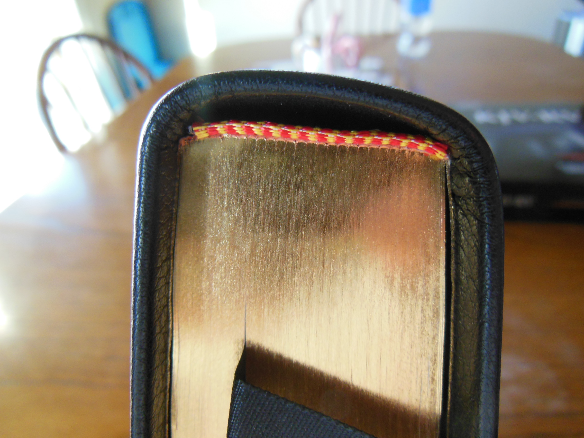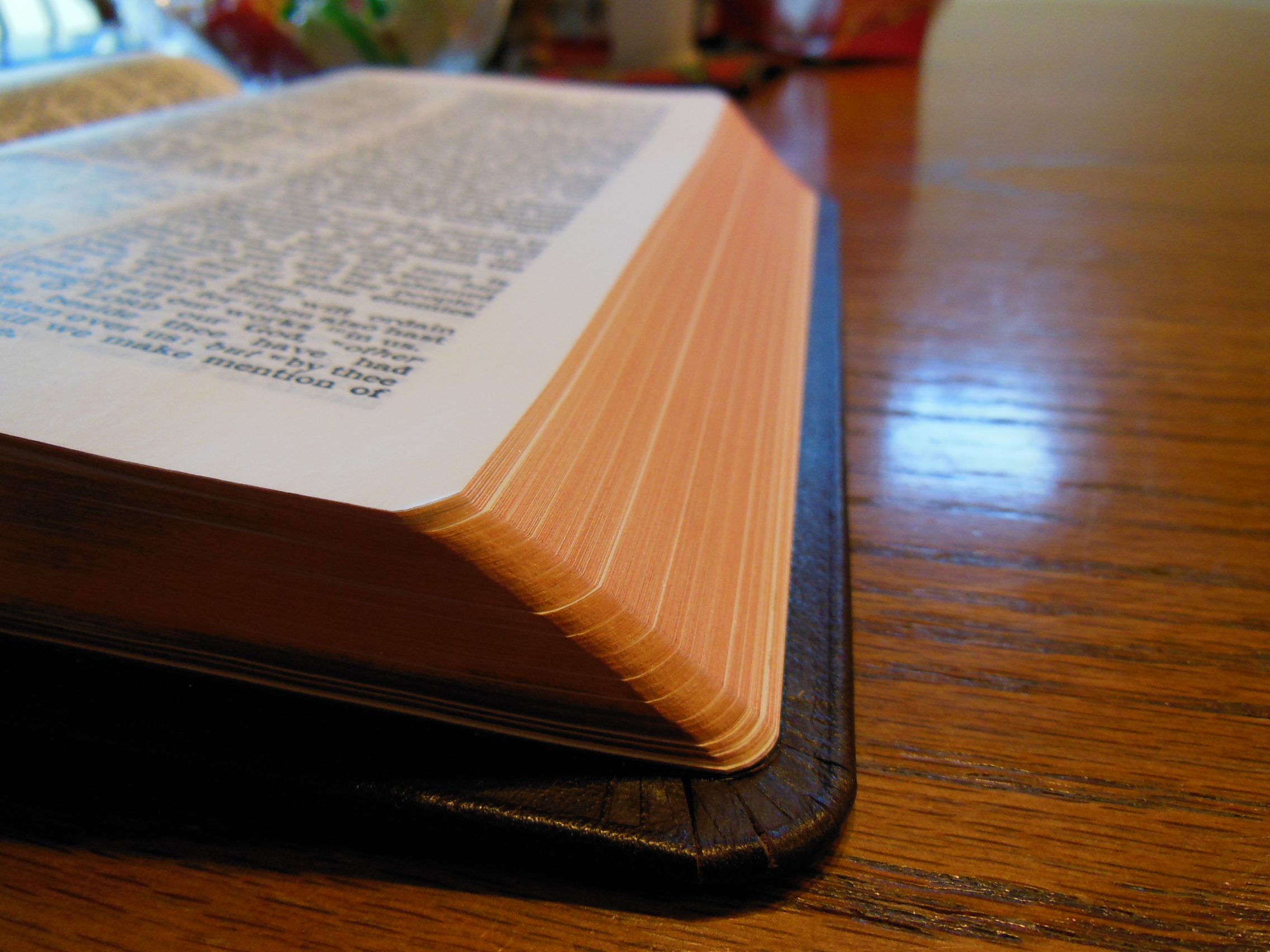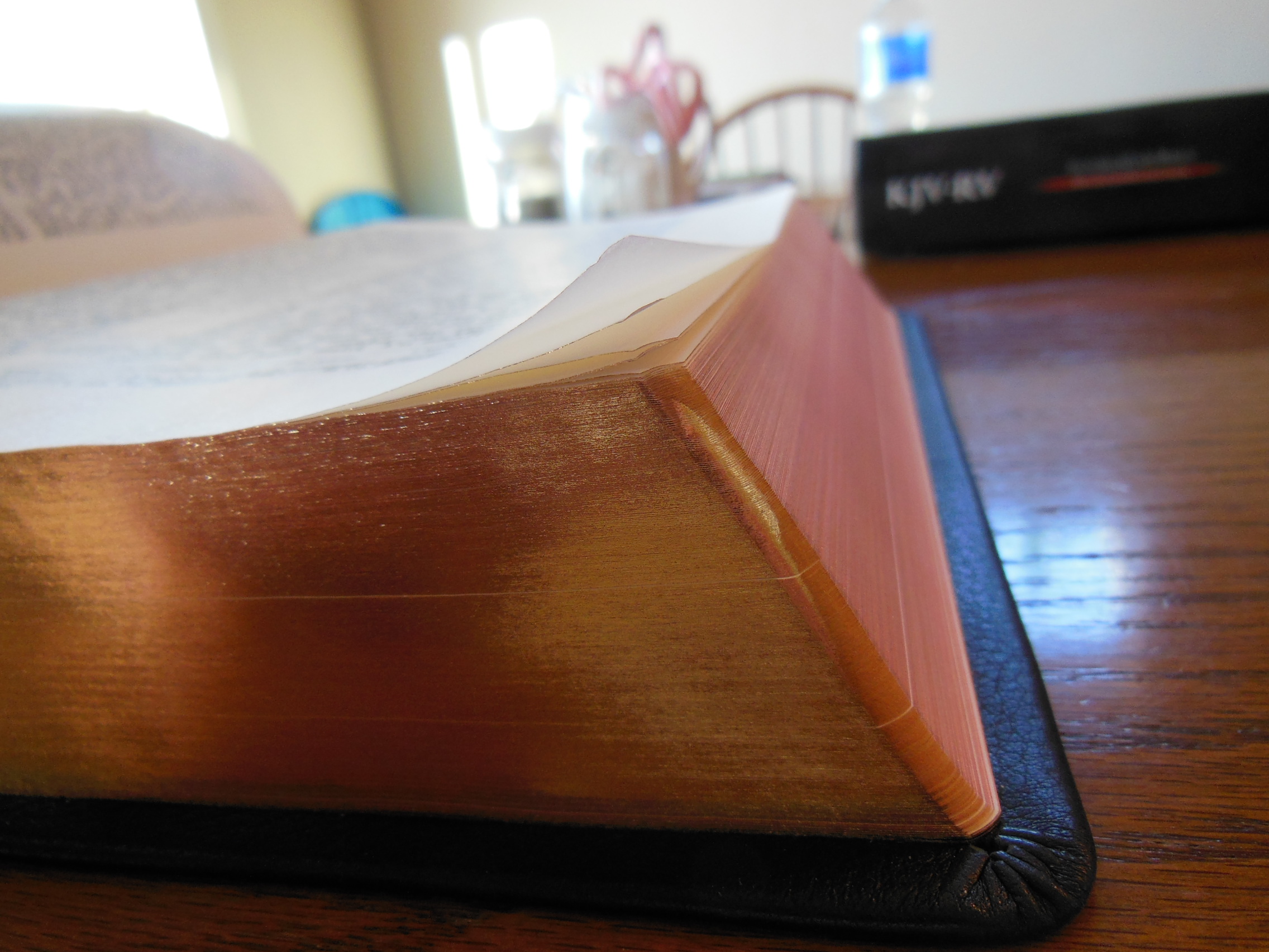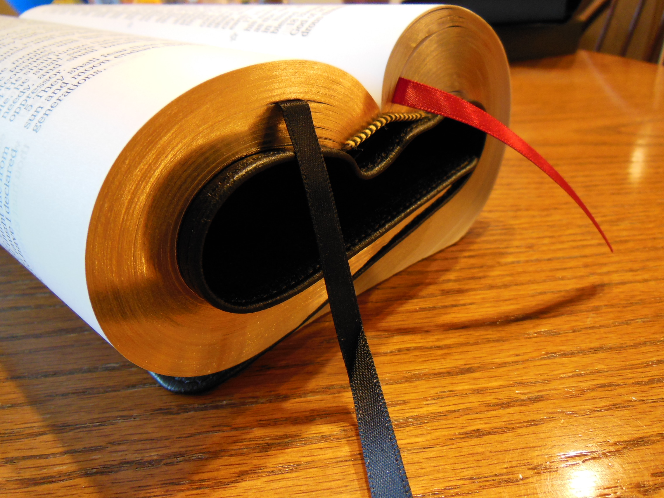 The front, inside, bottom edge has, “French Morocco Leather” in gold lettering stamped in it. Red and gold colored head and tail bands decorate this edition. It also includes two, black ribbon markers. The page edges are gold gilt. The corners and the spine are rounded. From the outside this Bible looks like what you’d expect a Bible to look like. It is a venerable style, and is very familiar.