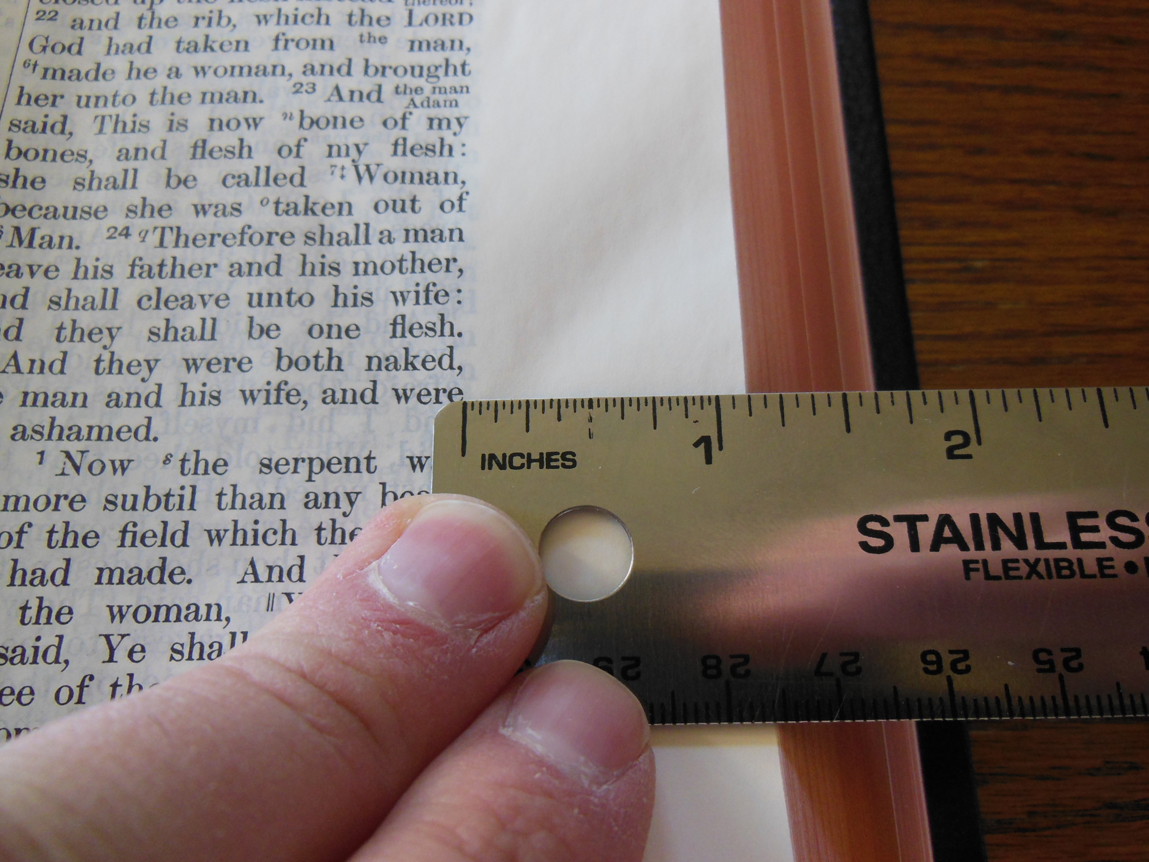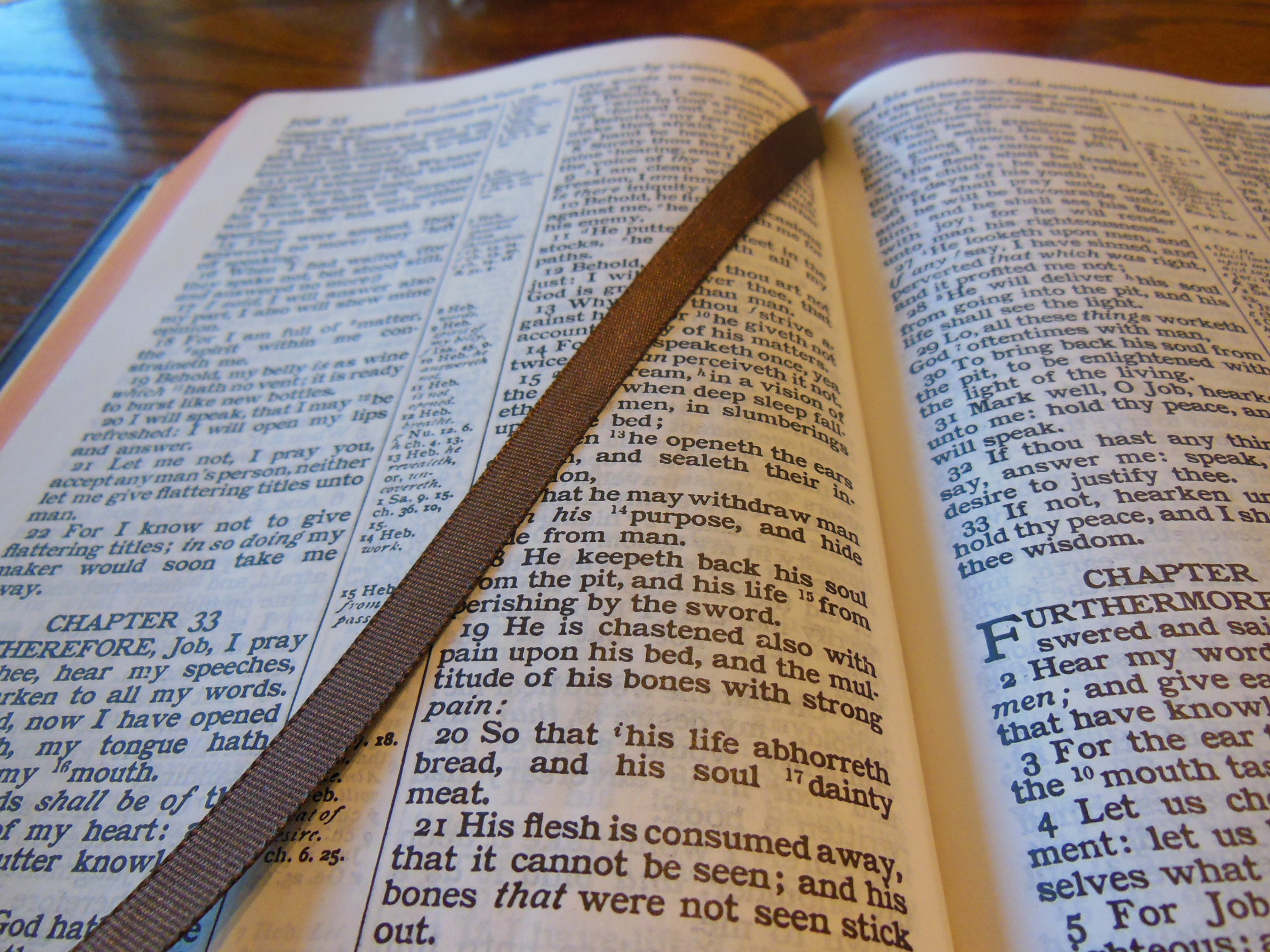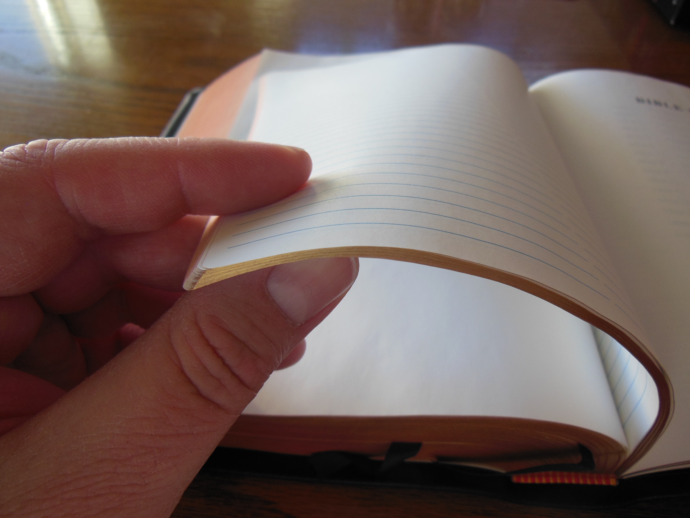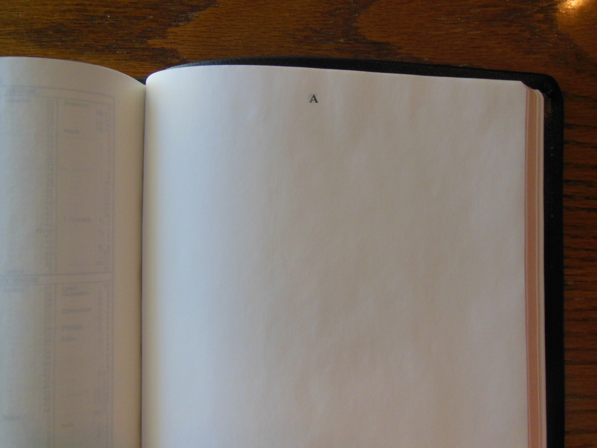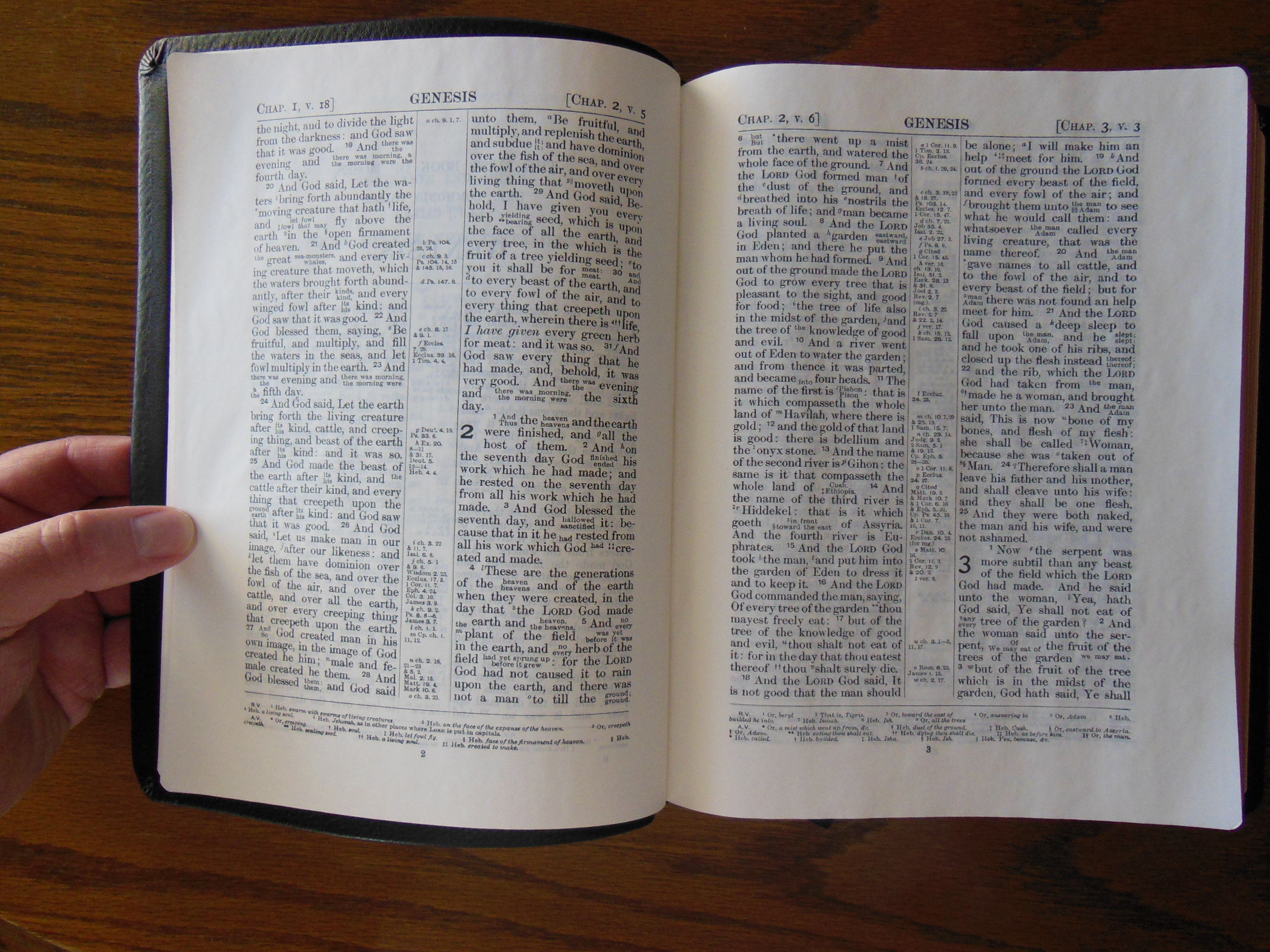 The front, inside, bottom edge has, “French Morocco Leather” in gold lettering stamped in it. Red and gold colored head and tail bands decorate this edition. It also includes two, black ribbon markers. The page edges are gold gilt. The corners and the spine are rounded. From the outside this Bible looks like what you’d expect a Bible to look like. It is a venerable style, and is very familiar.