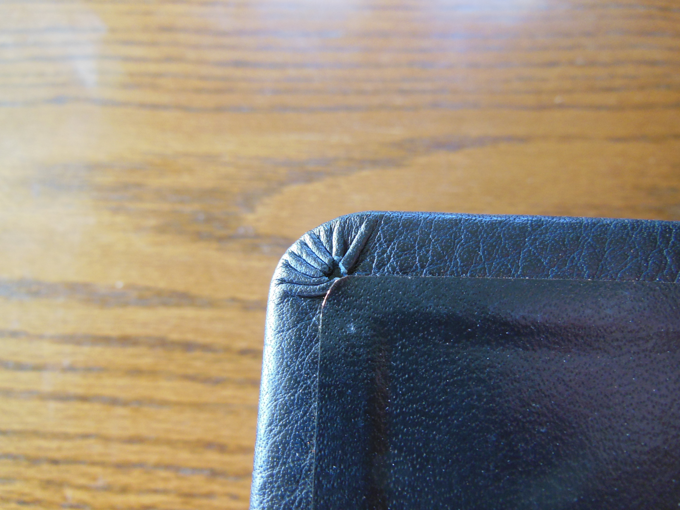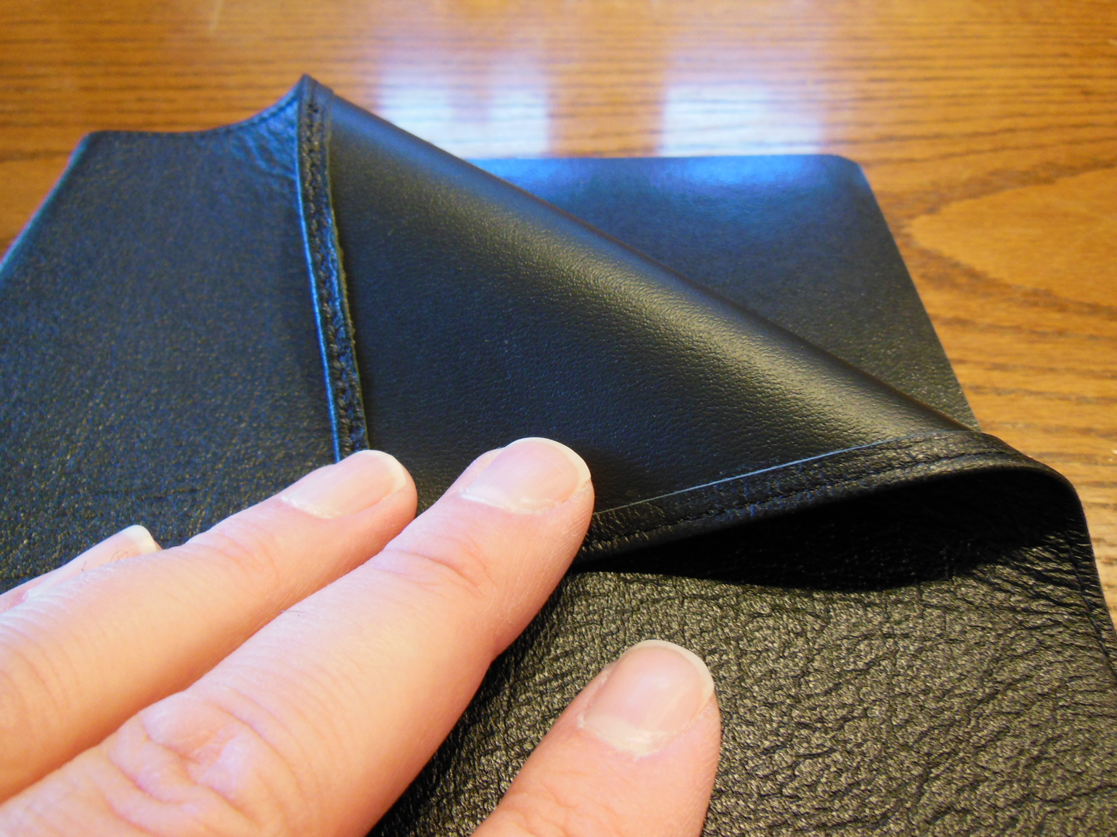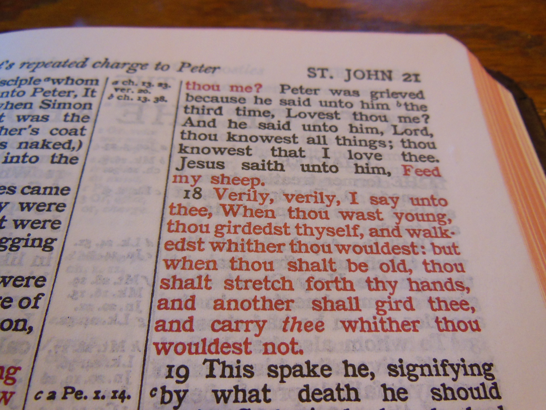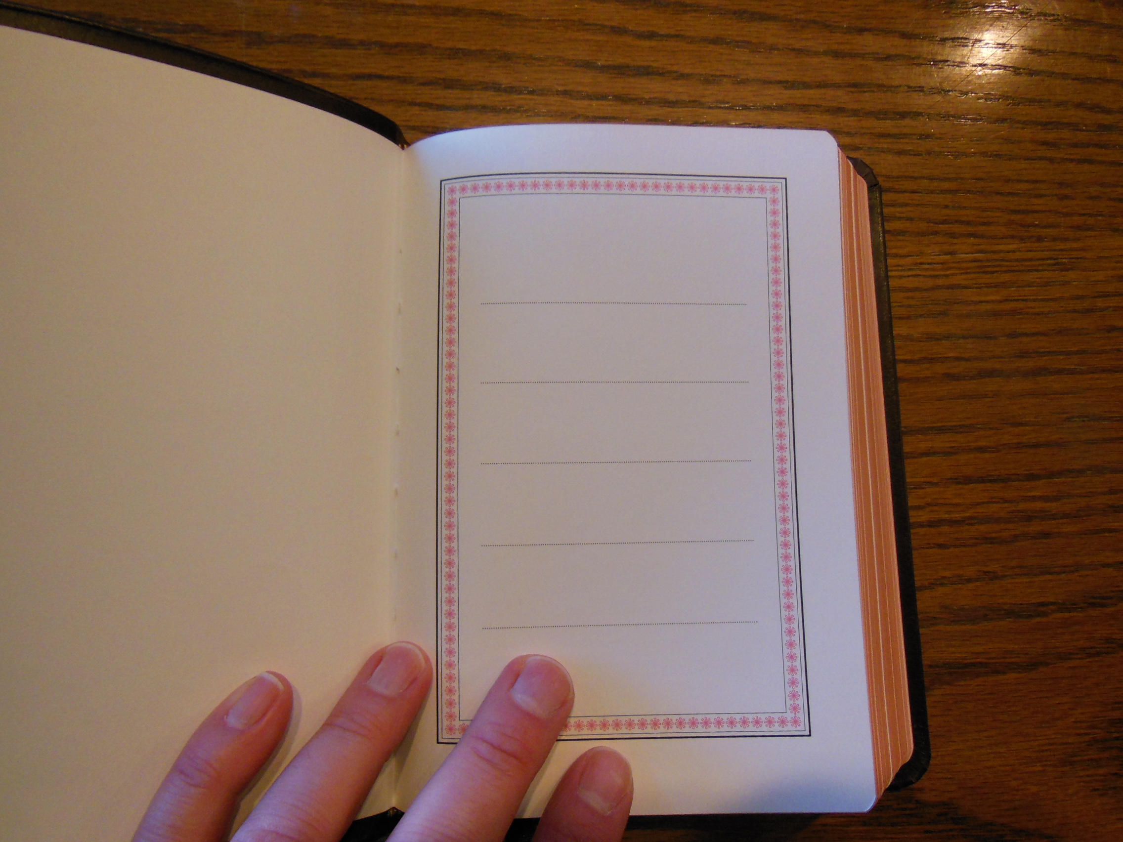 The front, inside, bottom edge has, “French Morocco Leather” in gold lettering stamped in it. Red and gold colored head and tail bands decorate this edition. It also includes two, black ribbon markers. The page edges are gold gilt. The corners and the spine are rounded. From the outside this Bible looks like what you’d expect a Bible to look like. It is a venerable style, and is very familiar.