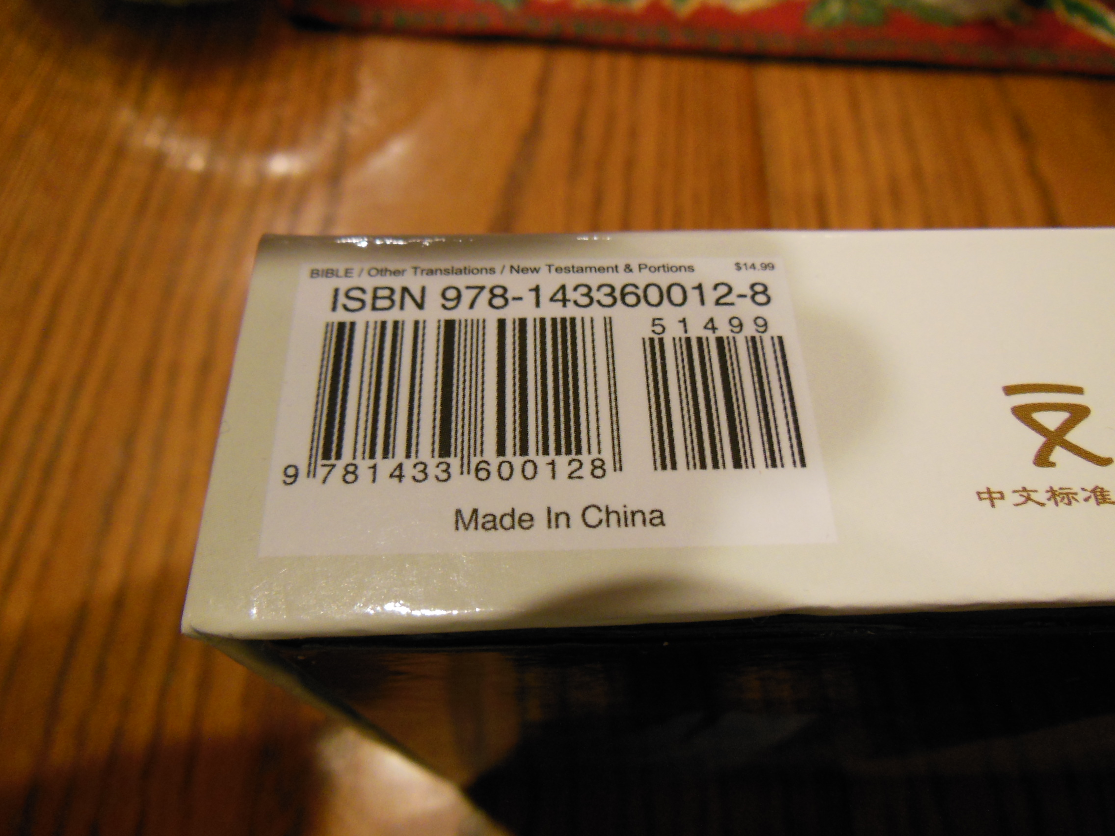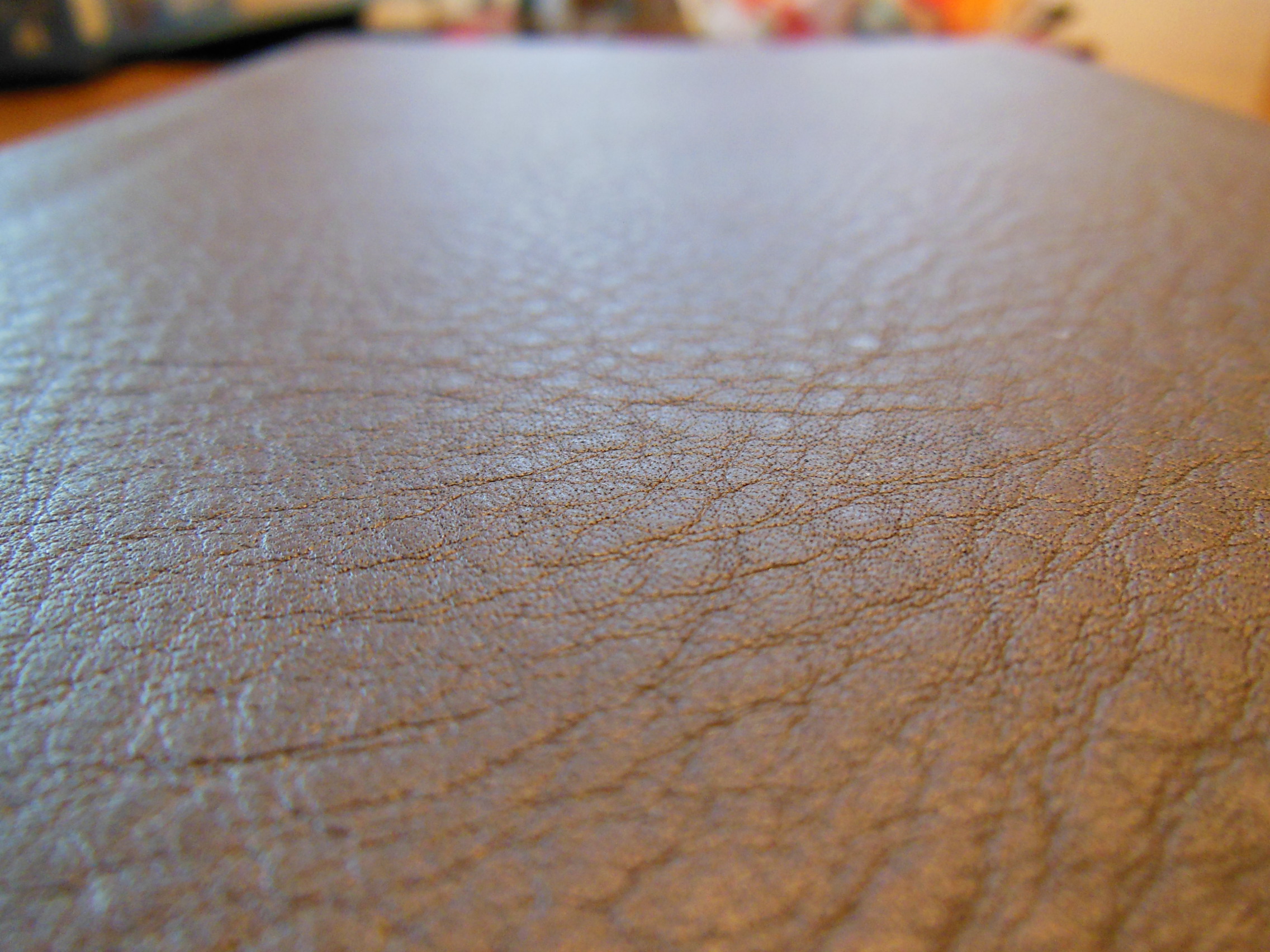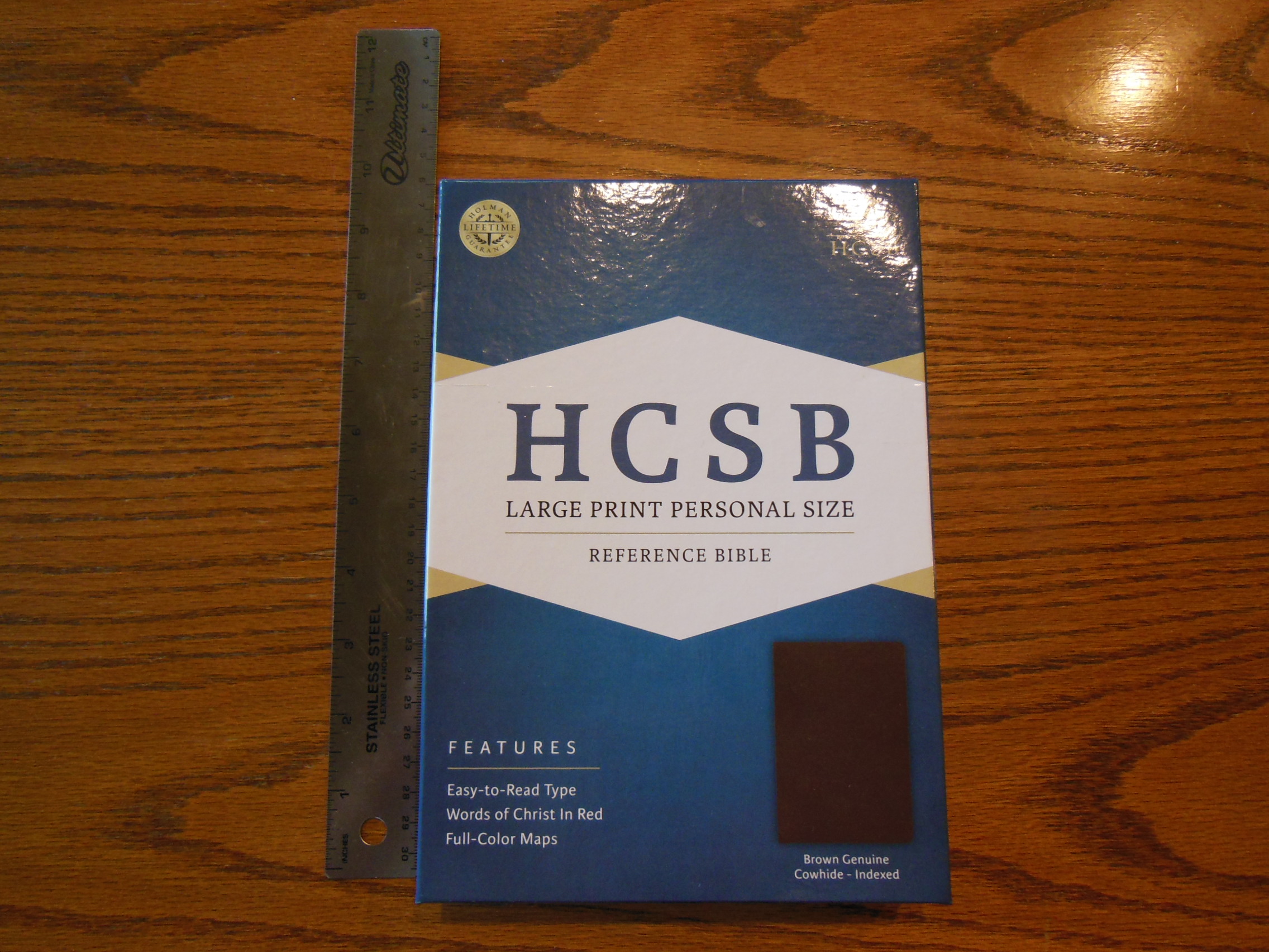 Inside the retail box, the Bible is wrapped in plastic wrap. This Bible is black in color, and is listed as genuine leather. It feels like pigskin leather. It is hard and shiny like pigskin leather. This one had an odd impression across the front cover. It has been being used for a couple months now and the impression is still there. If I had purchased this Bible I would have sent it back for an exchange, even though it does not affect the function.