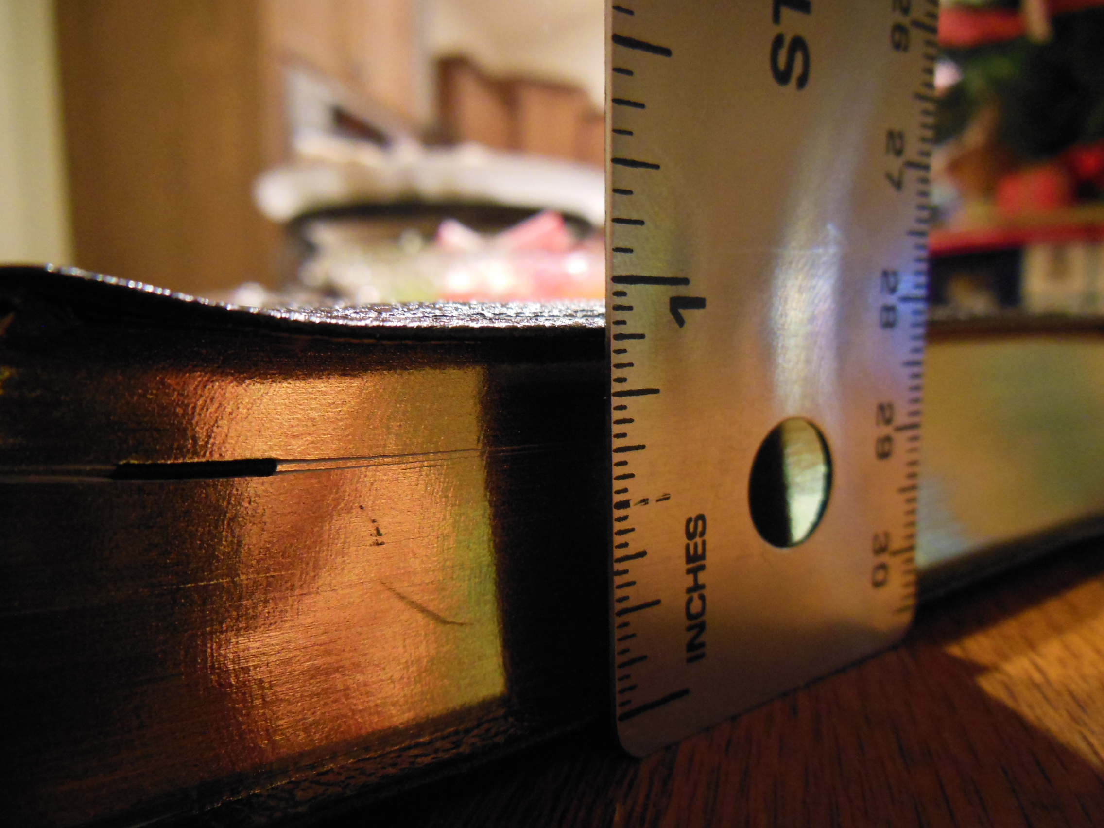 Upon opening it, I was struck with a strong odor. It smelled strongly, and not in a pleasant way. I have had it opened for a few days now, and the smell has dissipated quite a bit. There is a groove around the perimeter, and on the inside there is a gilt line.