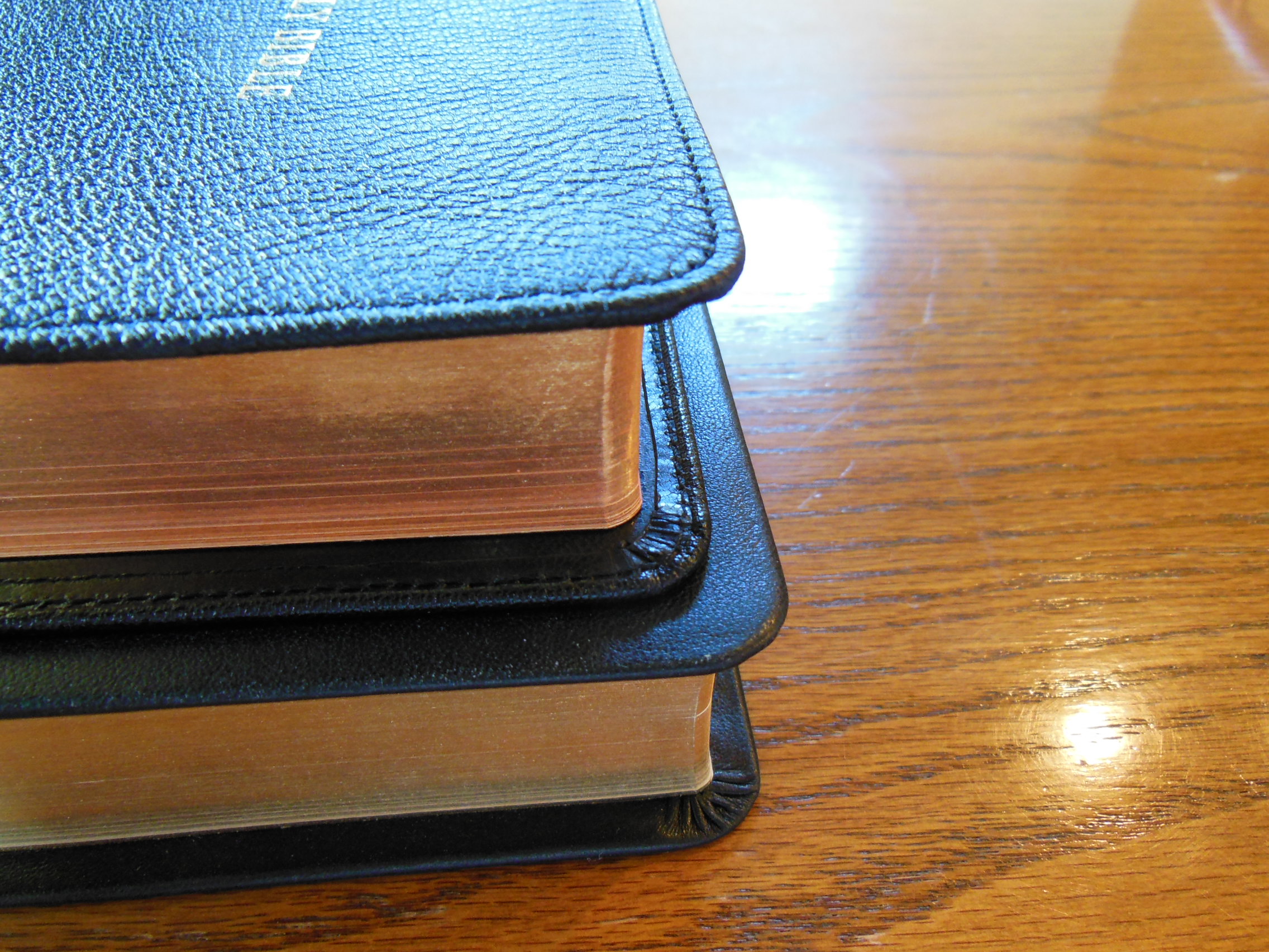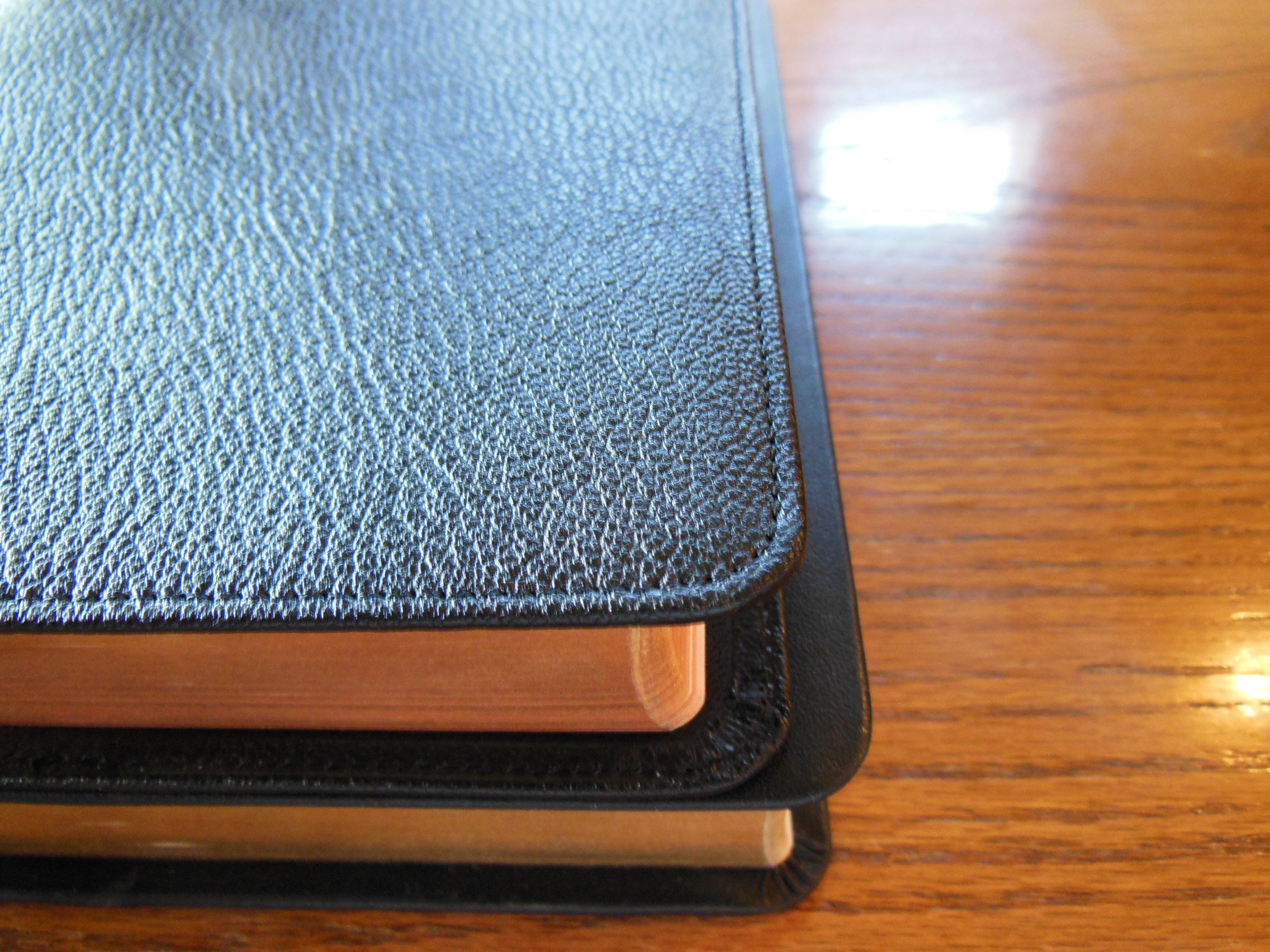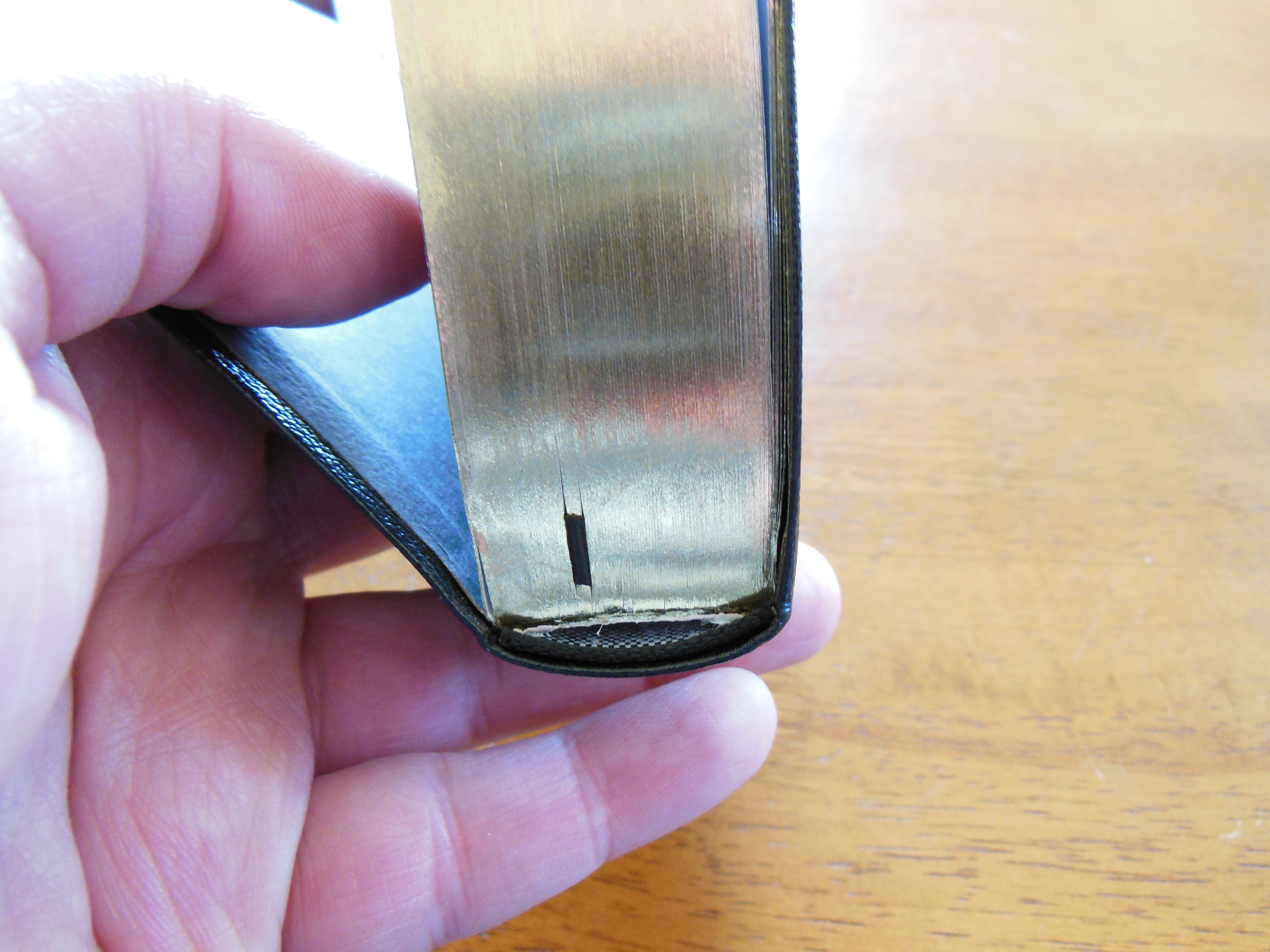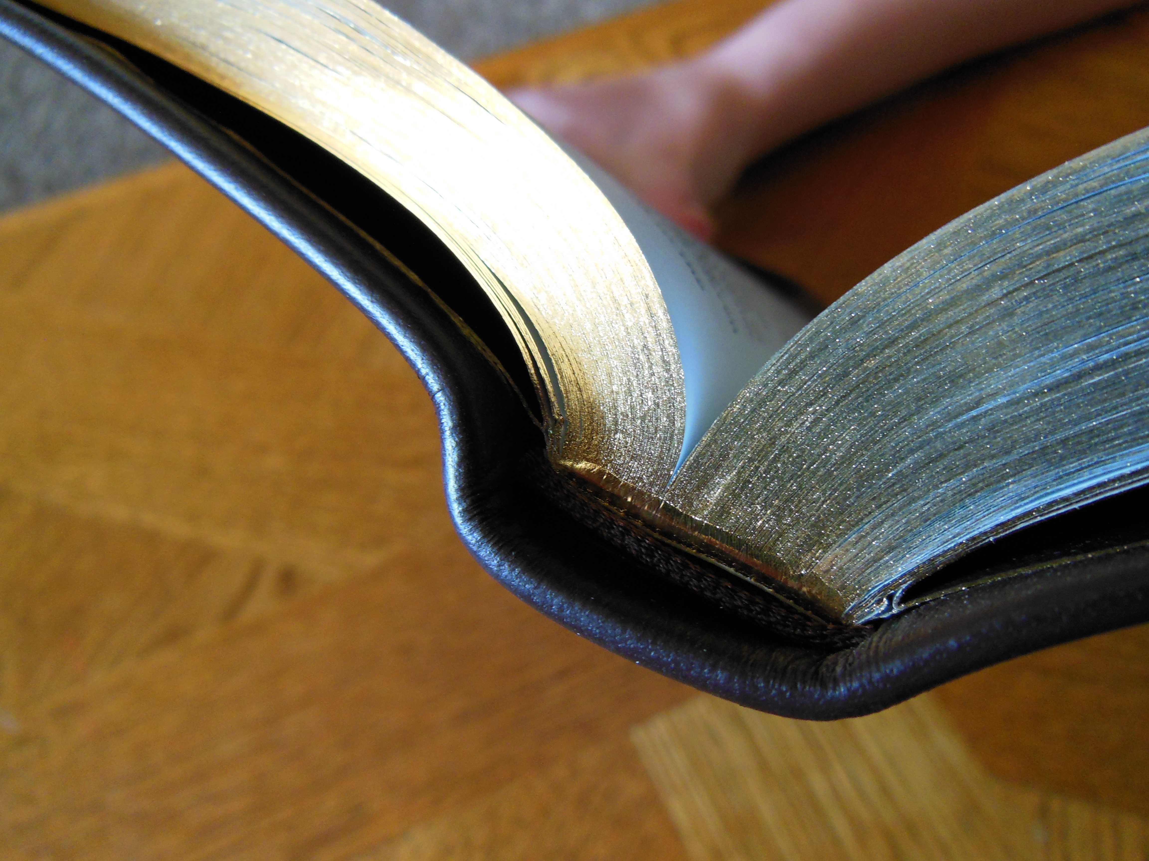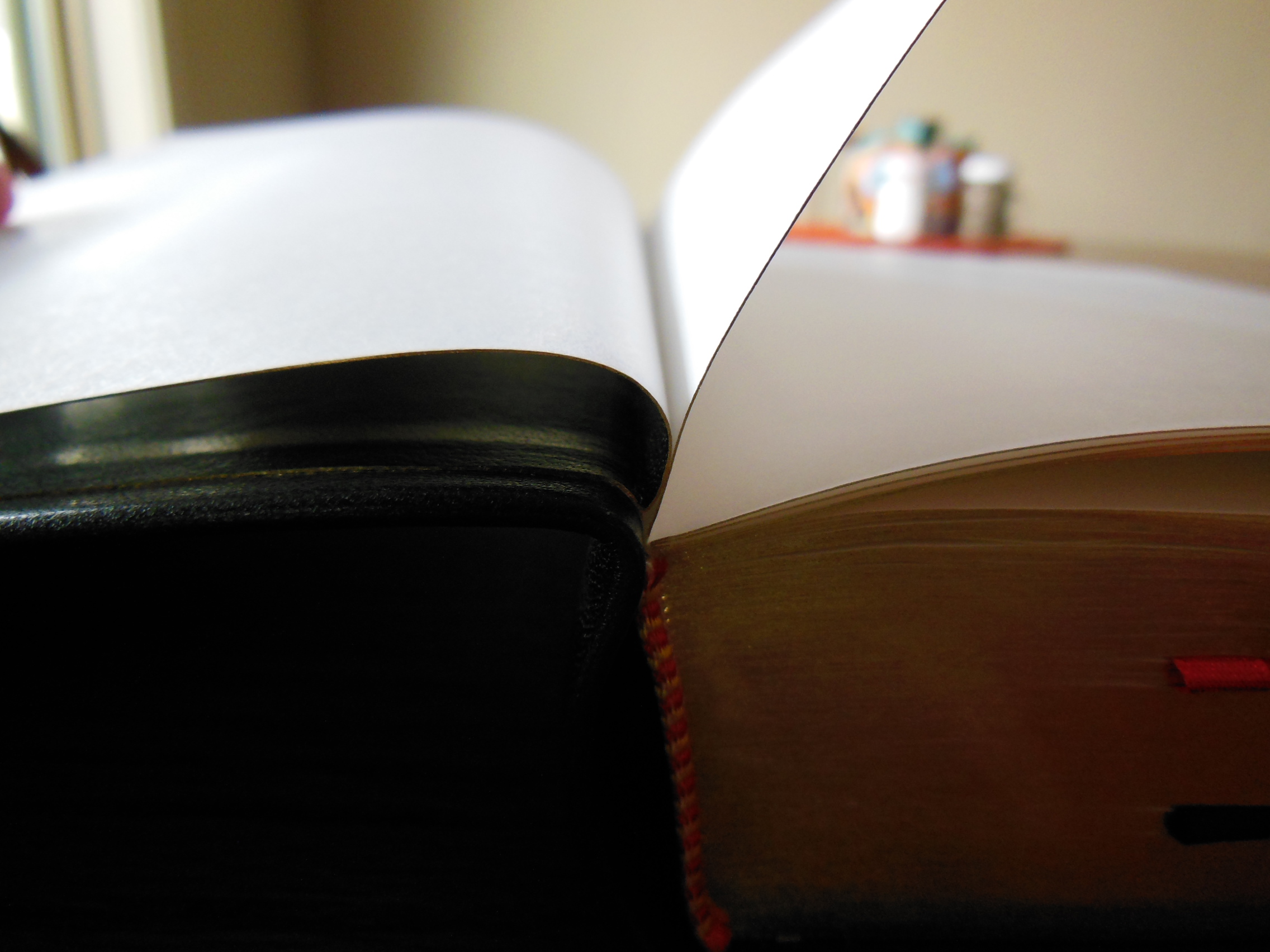 Once the plastic was discarded, I was pleasantly greeted by the familiar smell of a nice leather cover. There are numerous Bibles out there that say they have a genuine leather cover, but they look like and feel like bonded leather. They have a fake grain pressed into them and their covers look shiny. Not this big boy, the cover on this has nice texture and tactile feel to it. Honestly, for the small price of this Bible I’d expect a cheaper feeling cover. I thought the burgundy color was just right as well, not brazen, but still different than the venerable black.