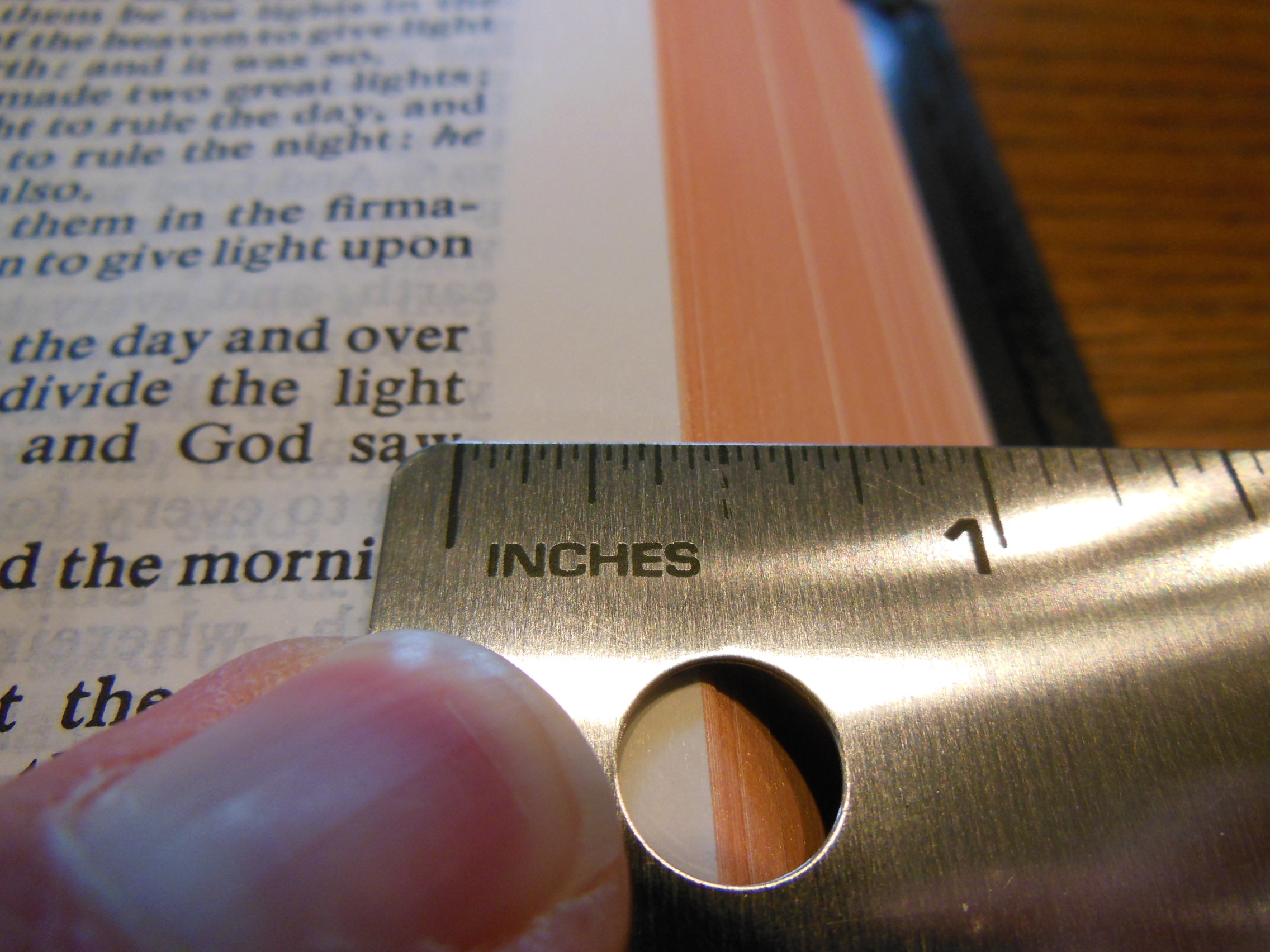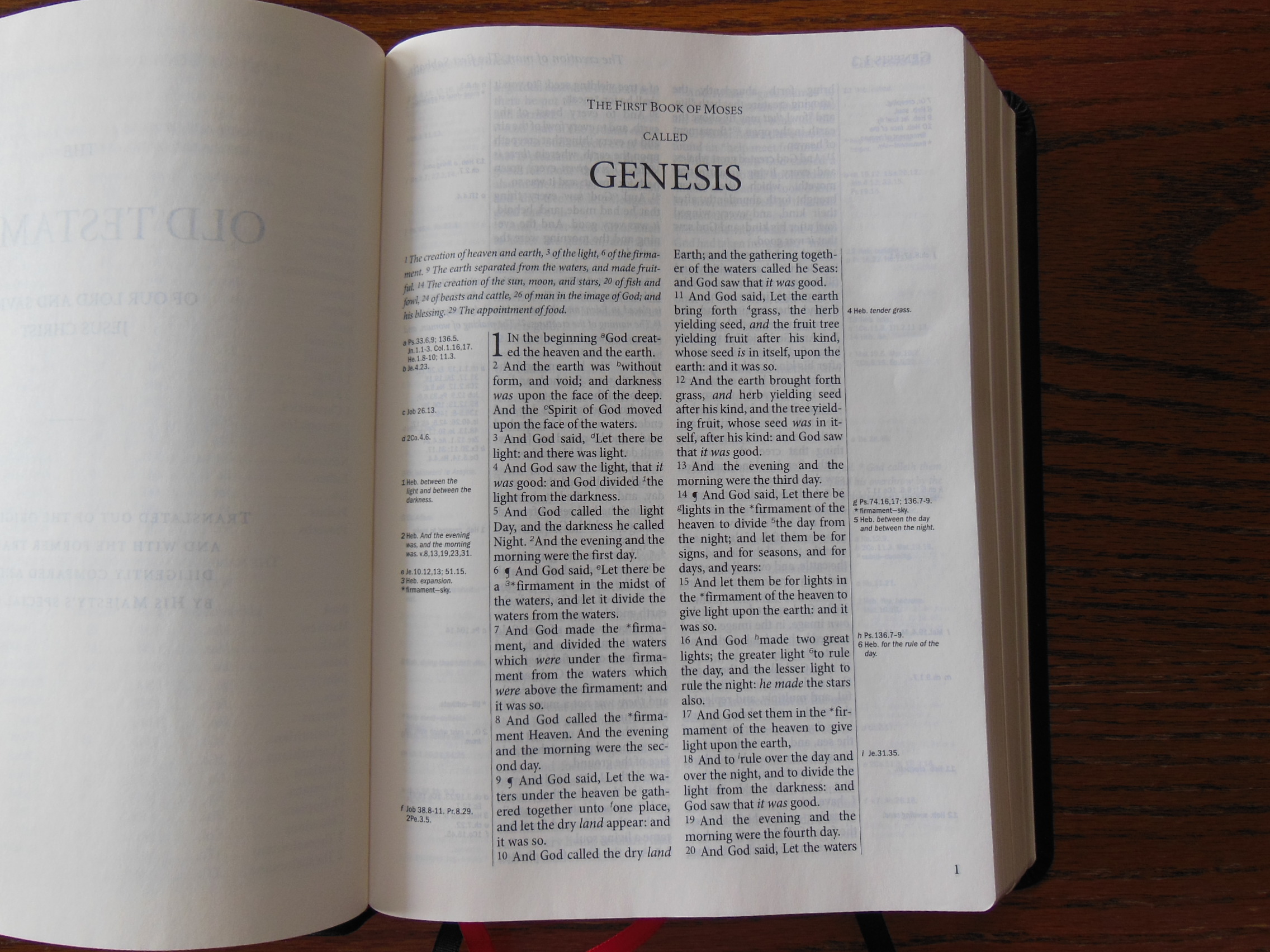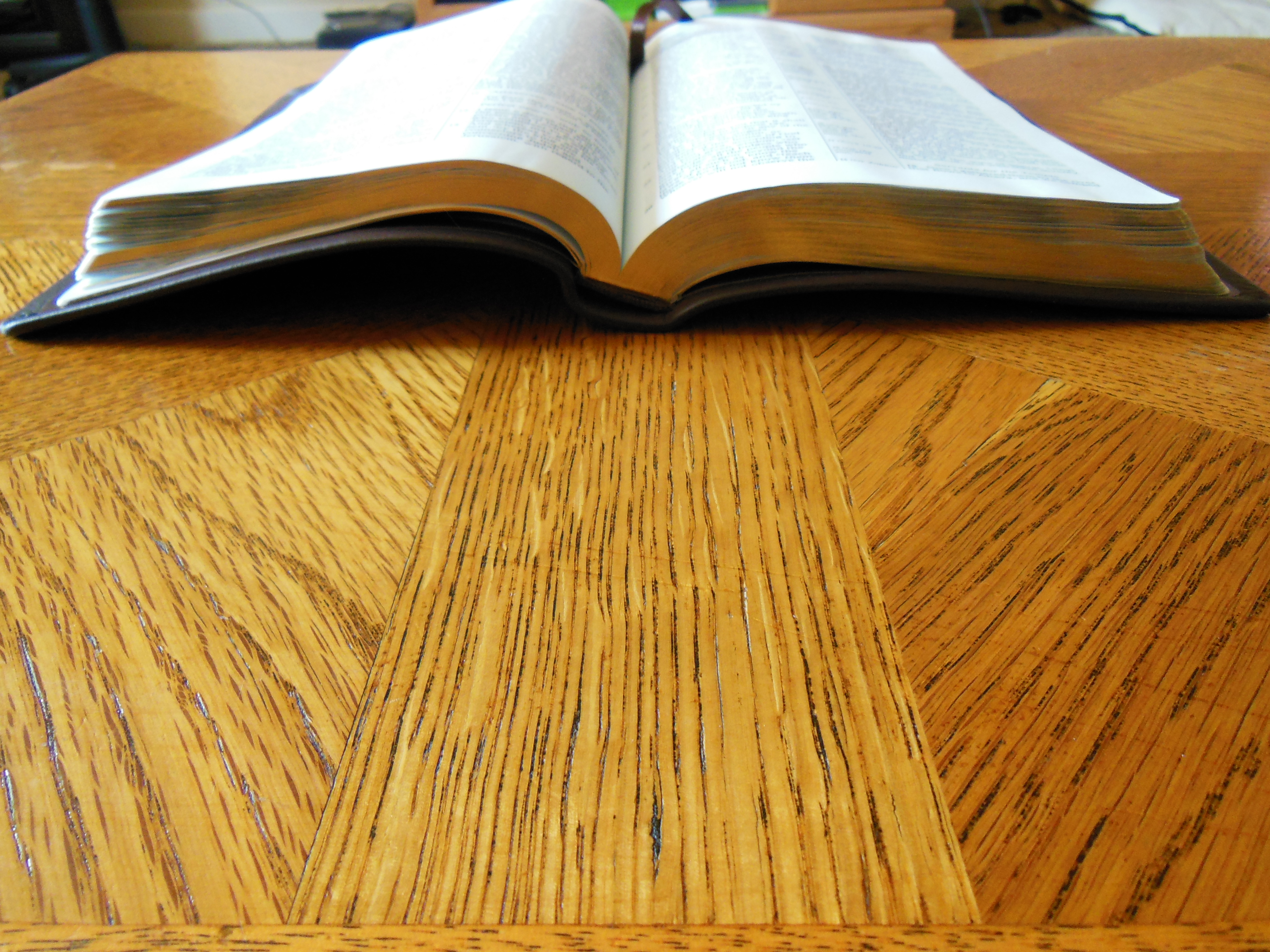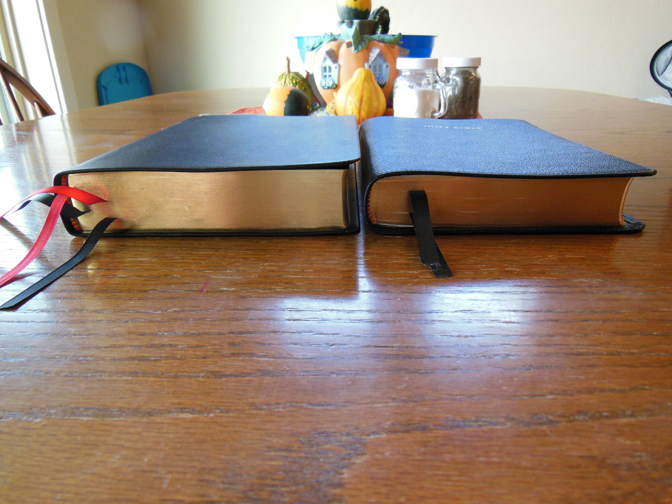 Once the plastic was discarded, I was pleasantly greeted by the familiar smell of a nice leather cover. There are numerous Bibles out there that say they have a genuine leather cover, but they look like and feel like bonded leather. They have a fake grain pressed into them and their covers look shiny. Not this big boy, the cover on this has nice texture and tactile feel to it. Honestly, for the small price of this Bible I’d expect a cheaper feeling cover. I thought the burgundy color was just right as well, not brazen, but still different than the venerable black.