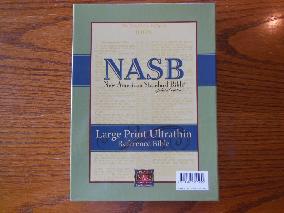 The spine of the Bible has the words, “Holy Bible” at the top. Immediately below is, “New American Standard Bible Updated Edition.” At the bottom is, “Foundation Publications” and the NASB logo. Above them are the words, “Giant Print.” There are decorative lines separating the words.
