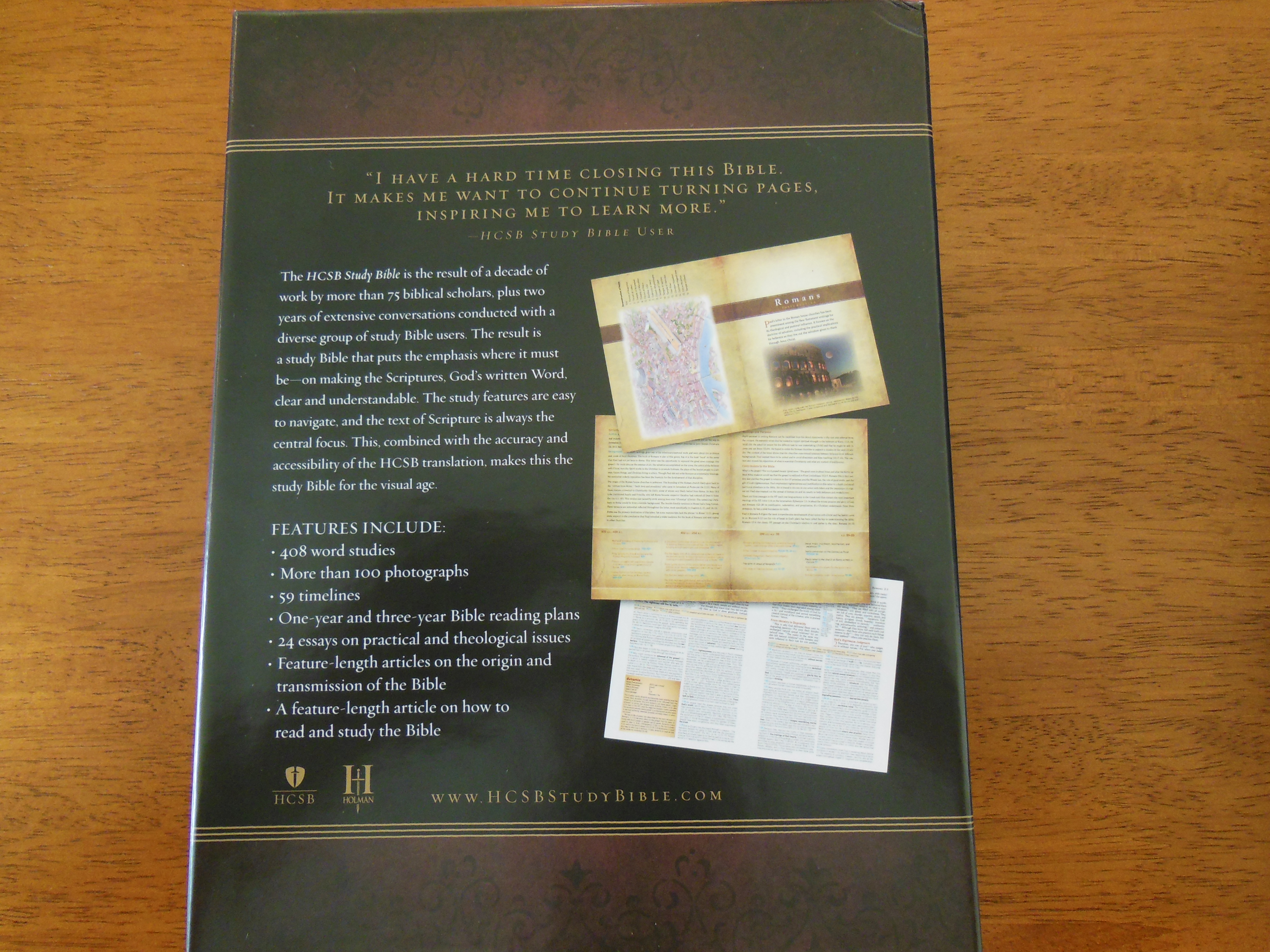 My review copy arrived damaged. It was packaged sufficiently. The damage looked like a problem from the factory. The end papers in the front as well as the presentation page, and the first pages of this Bible were deeply creased down the center. This is probably a fluke, but if you did get a damaged Bible, Holman will be quick to replace it.