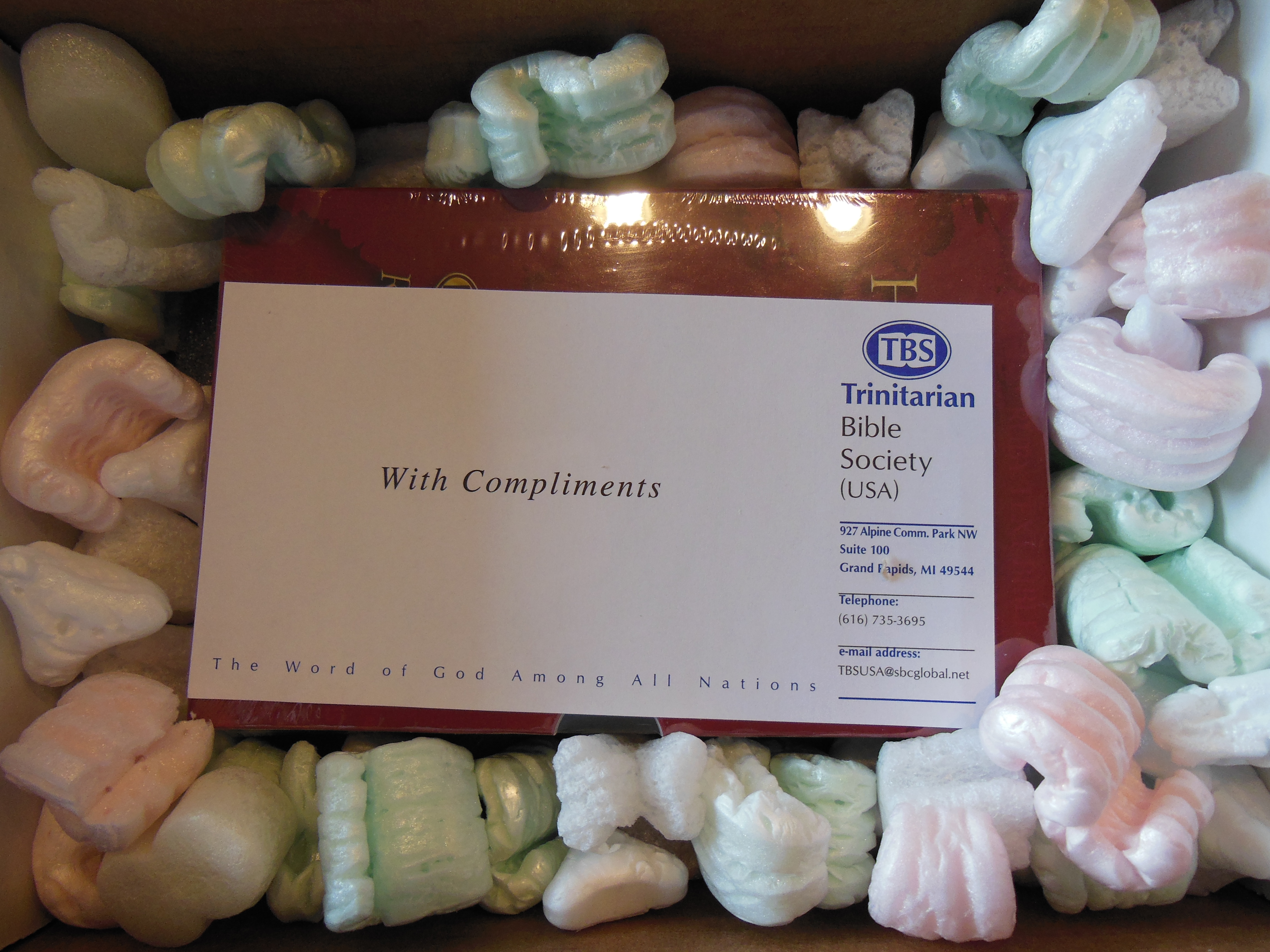 TBS took great care in packaging this Bible for shipping. When it arrived at my house it was in a clamshell type cardboard box filled with packing peanuts.  The Bible was placed on top of a foam pad inside the box.