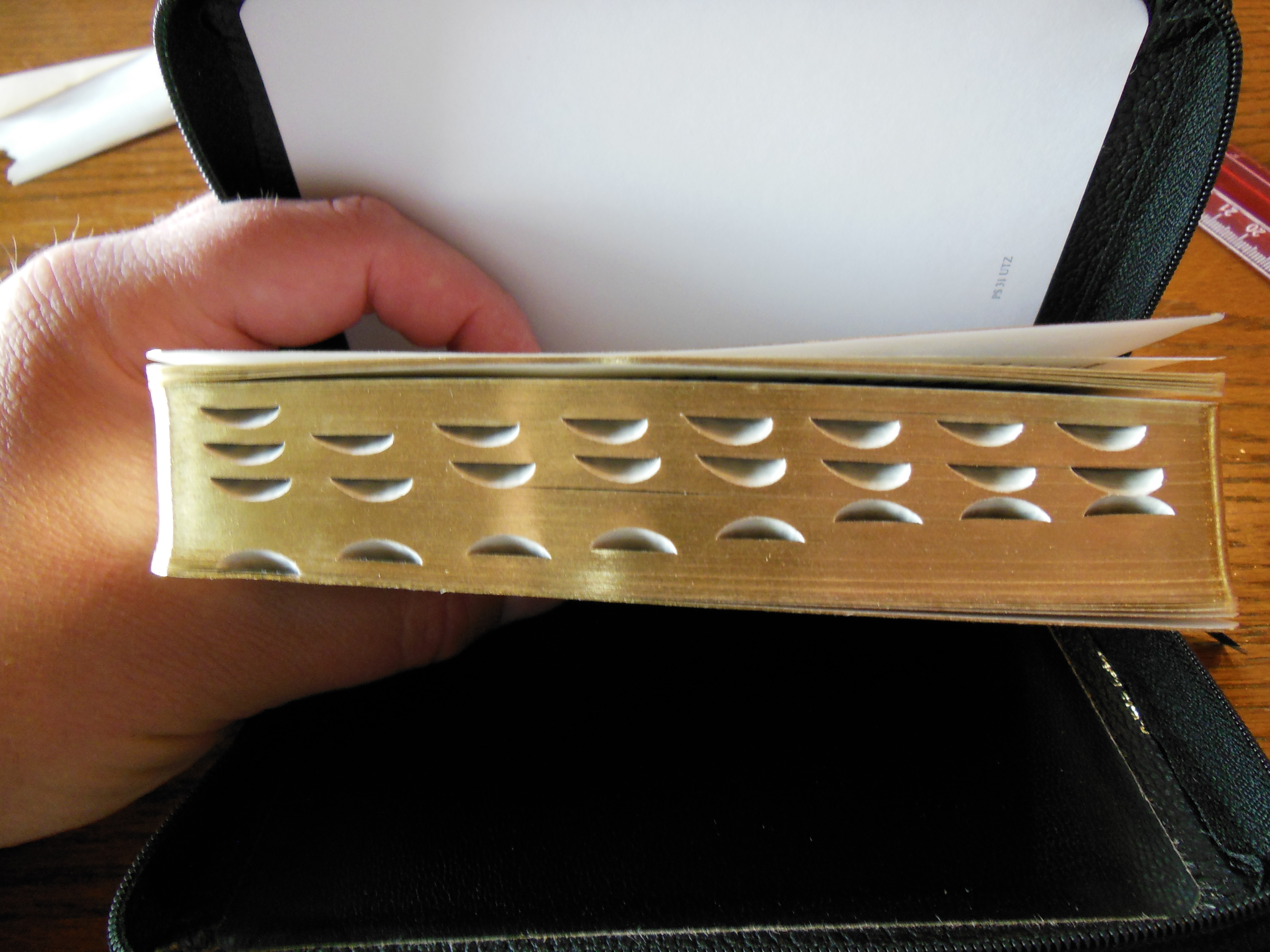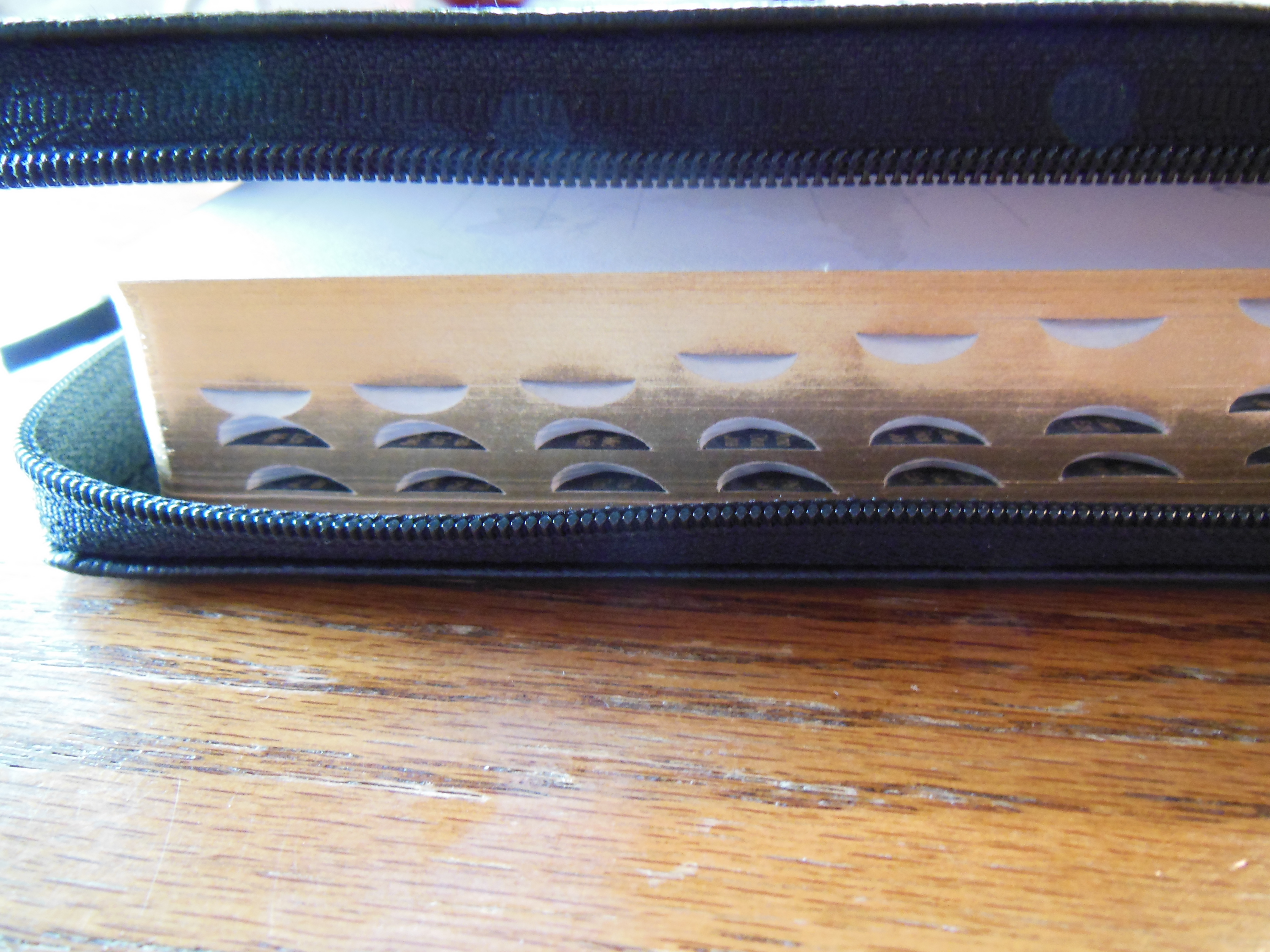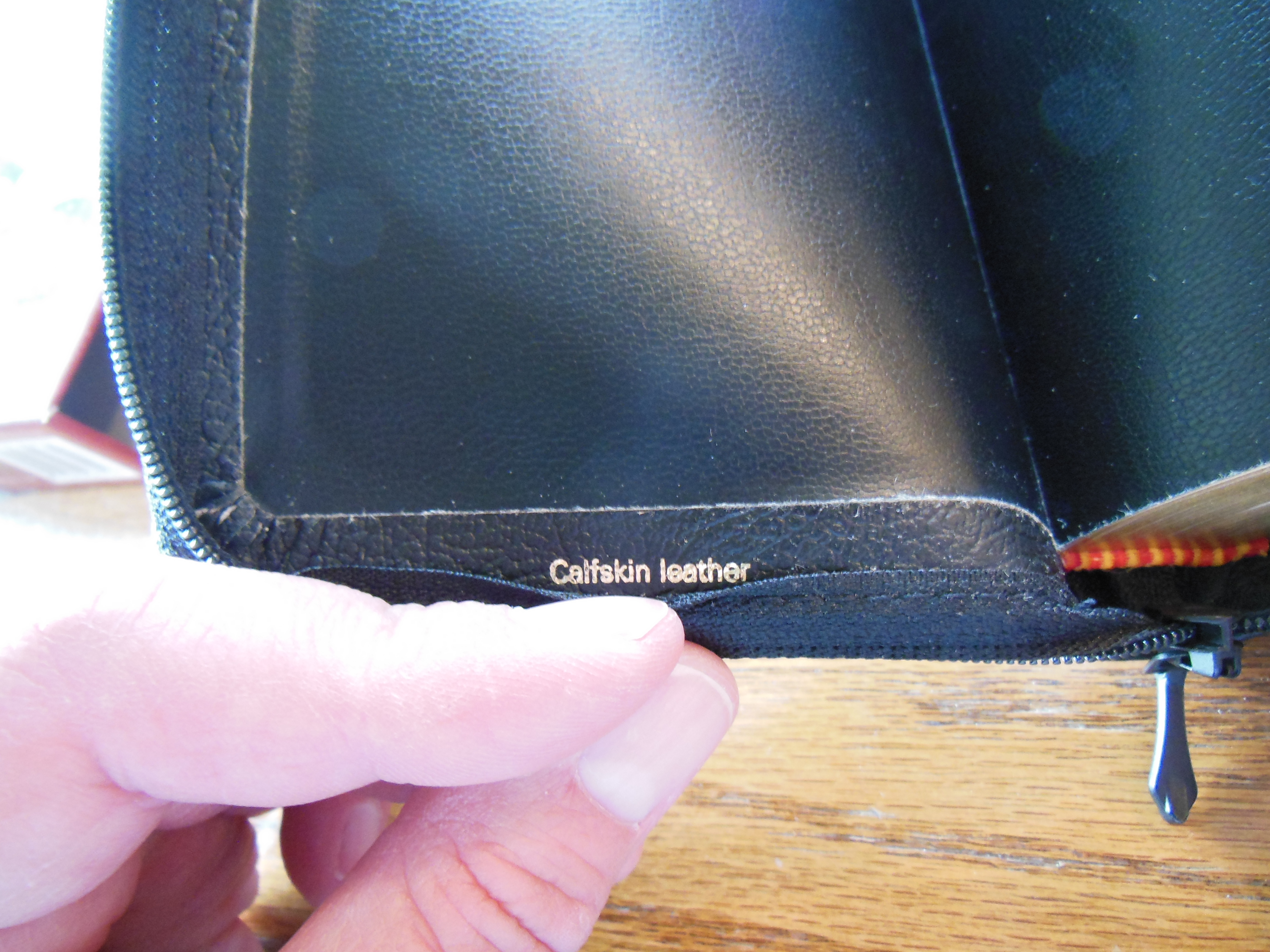 DSCN4046  I unzipped the cover and looked at the inside cover first. It is a case bound Bible so the inner liner is a vinyl that is paper backed and glued to the calfskin and end papers of the text block. The corners of the cover are not easily seen as they are covered by the zipper material that is sewn to the perimeter of the cover, making the cover perimeter stitched. There are read and gold head and tail bands decorating the Pocket Reference.   DSCN4061