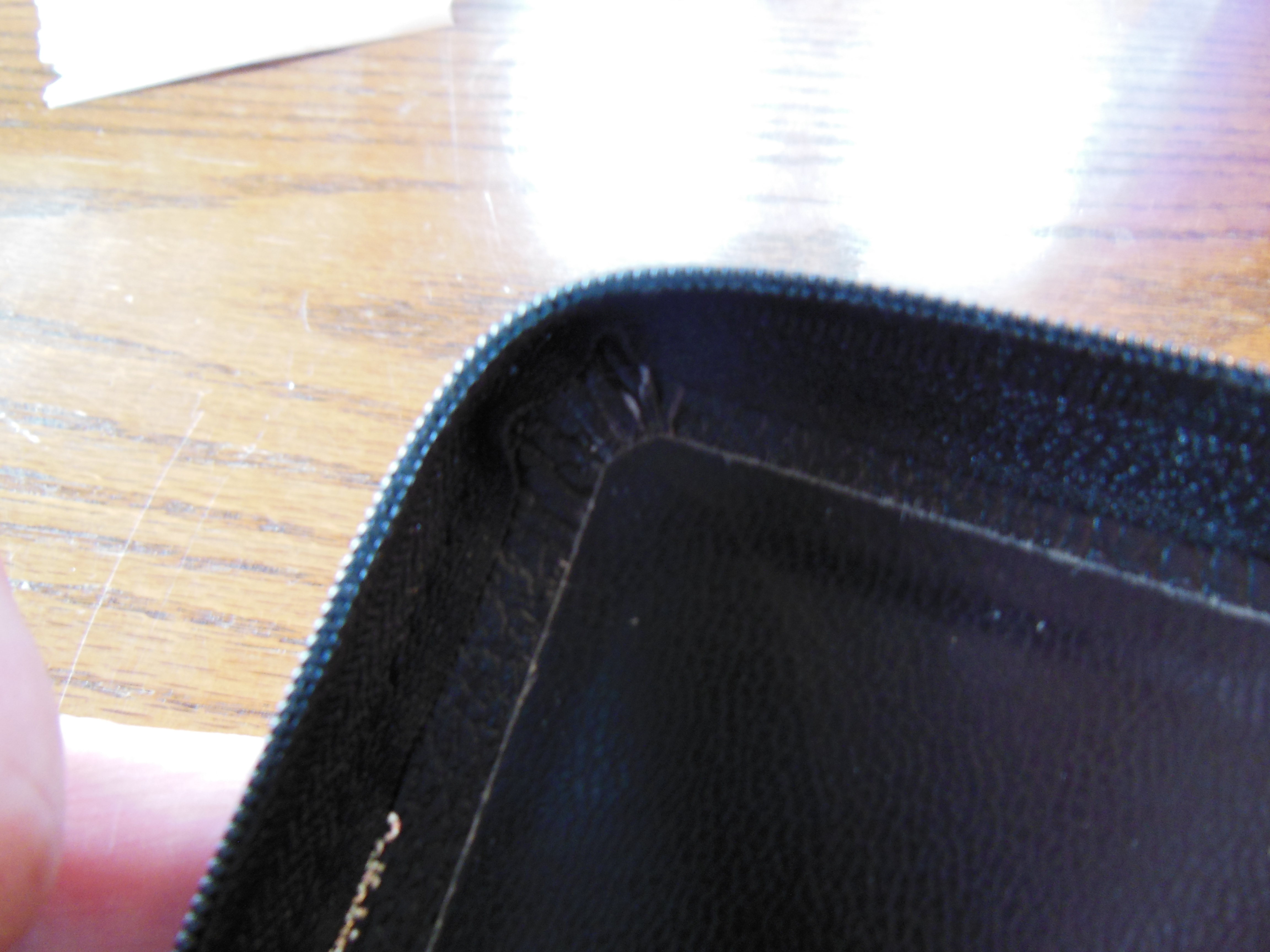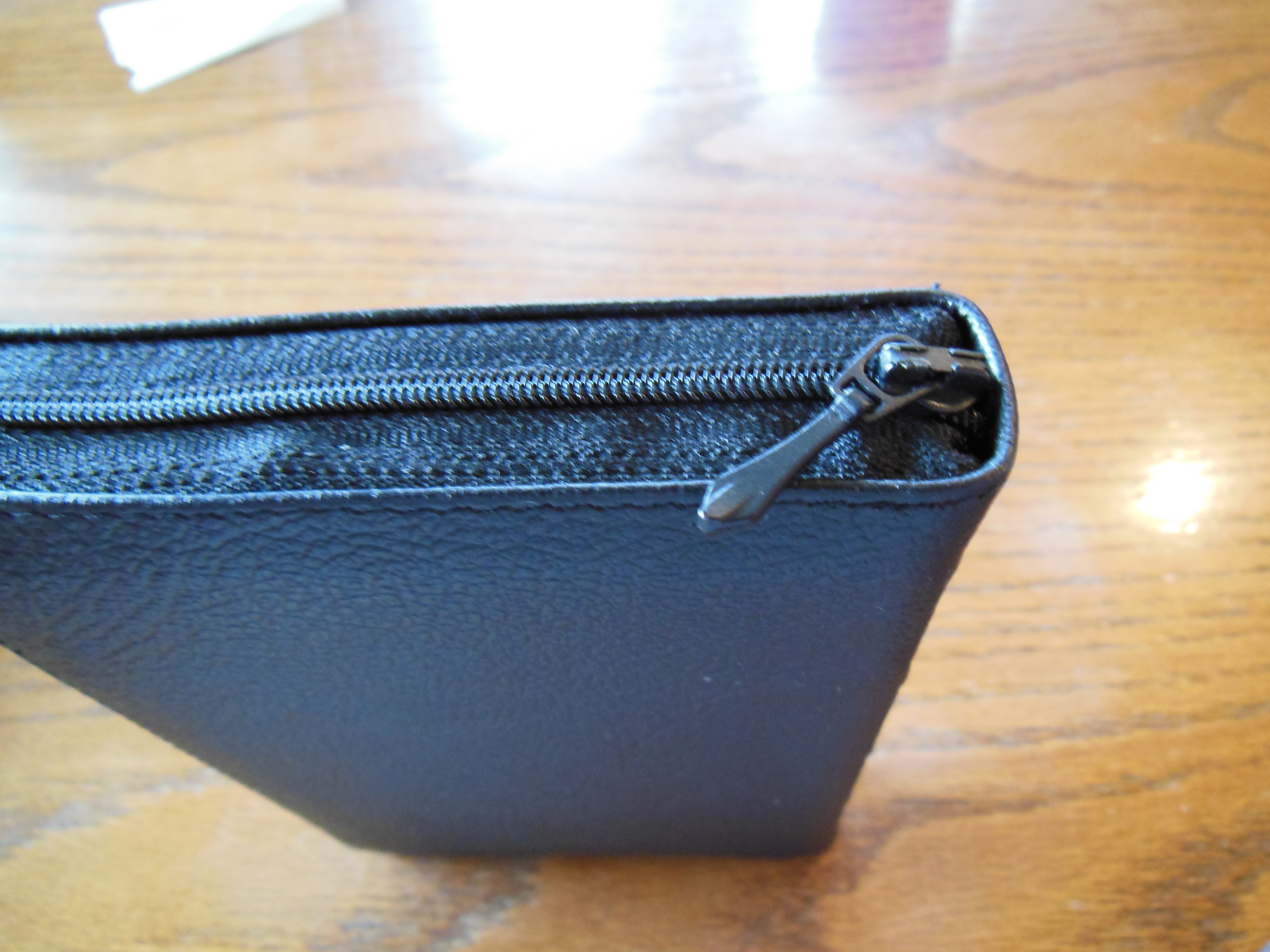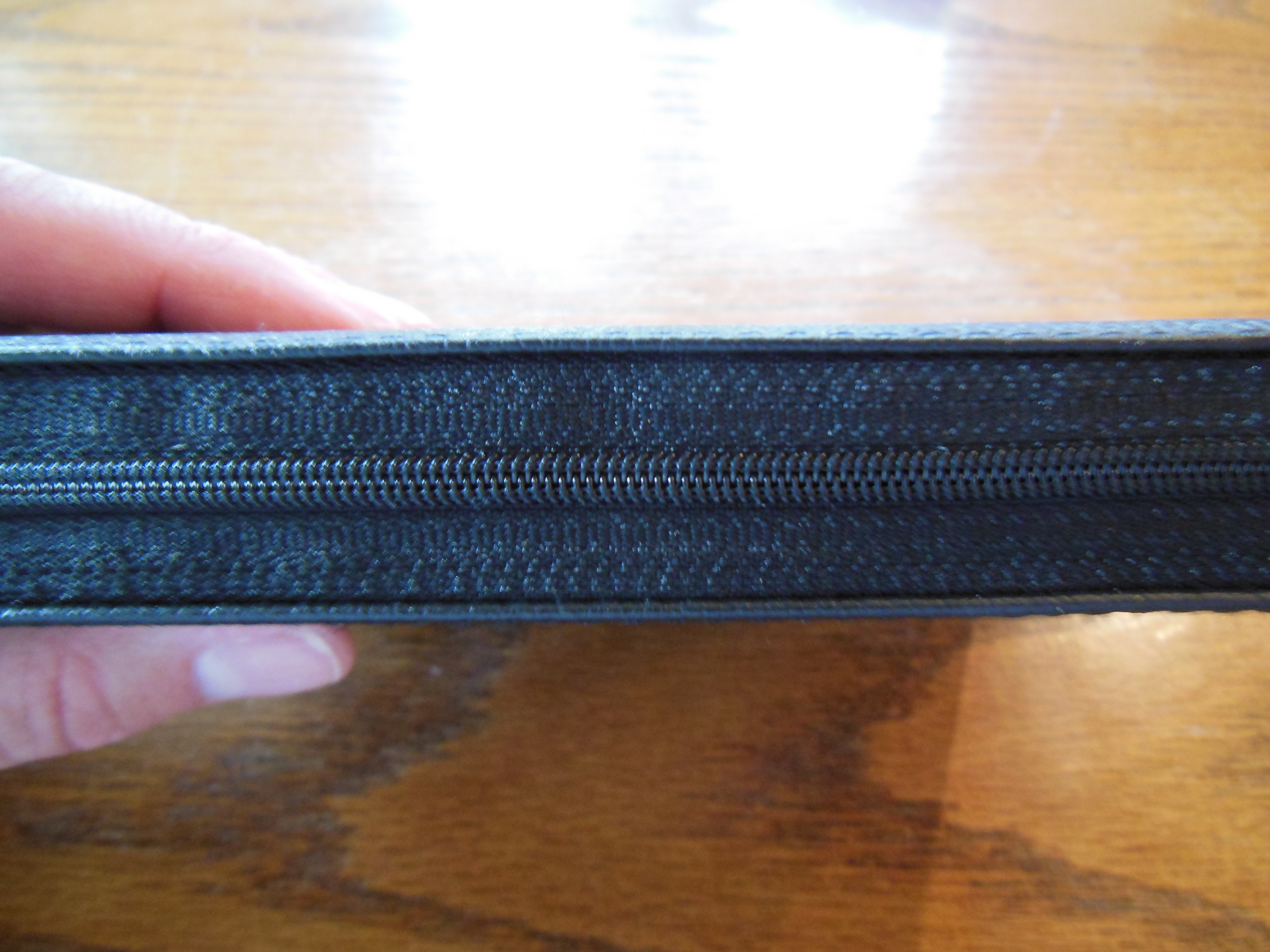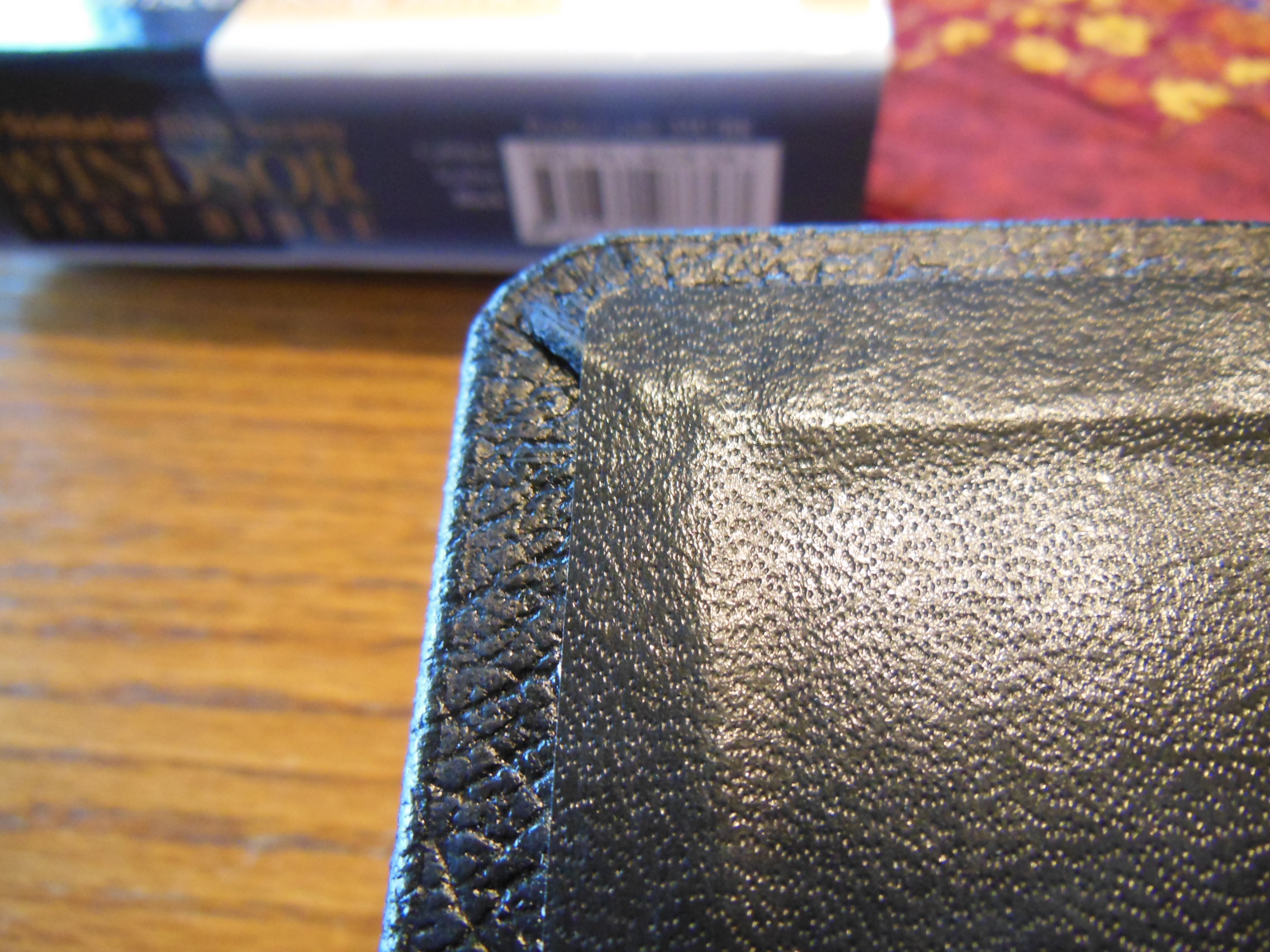 DSCN4046  I unzipped the cover and looked at the inside cover first. It is a case bound Bible so the inner liner is a vinyl that is paper backed and glued to the calfskin and end papers of the text block. The corners of the cover are not easily seen as they are covered by the zipper material that is sewn to the perimeter of the cover, making the cover perimeter stitched. There are read and gold head and tail bands decorating the Pocket Reference.   DSCN4061