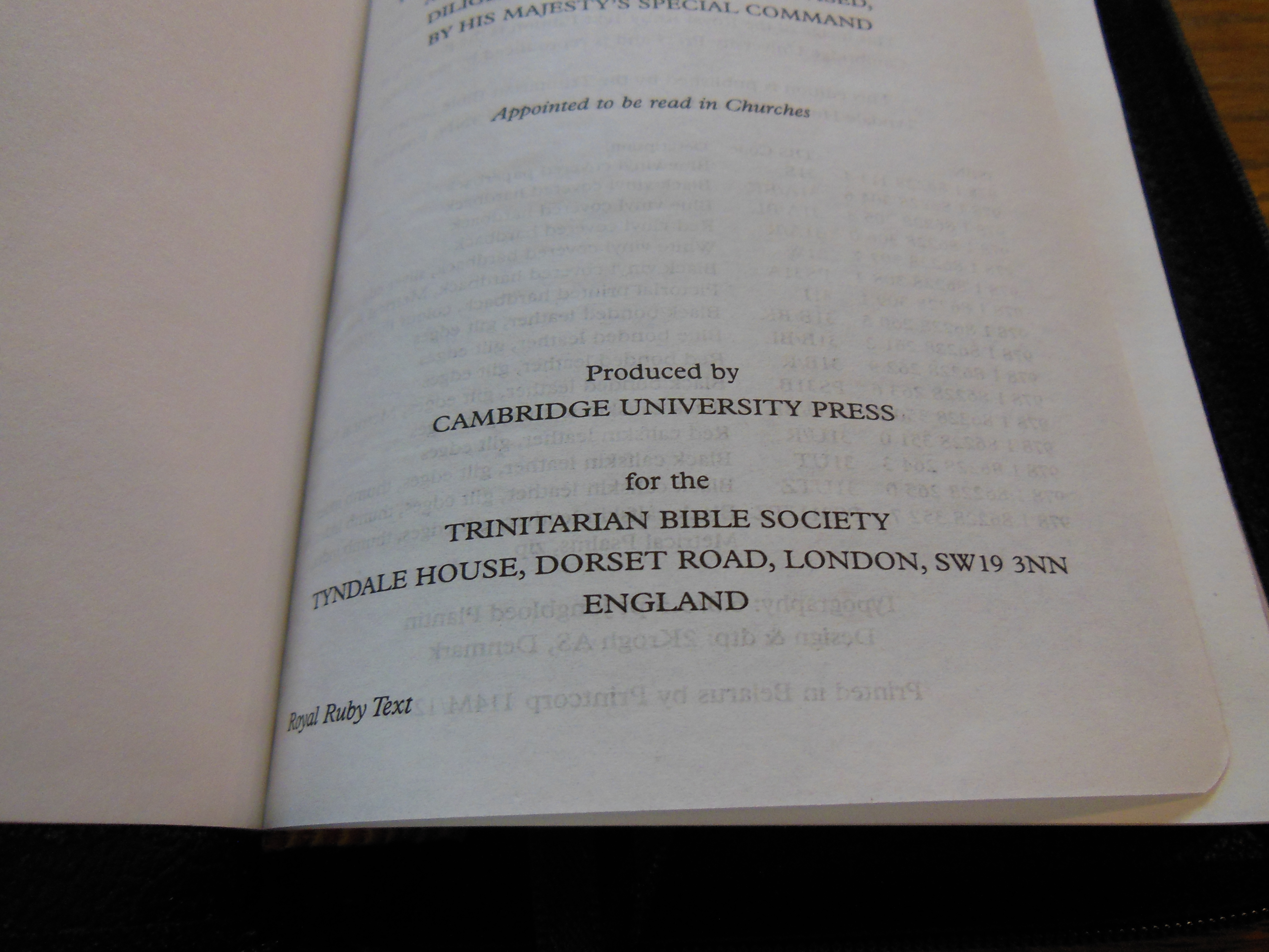 Contrary to popular belief, this edition of the Classic Reference Bible is not printed by Cambridge. Cambridge oversees the printing. It is also a typesetting of the Cambridge Concord that has been shrunk, and maintains the pagination. It is printed and bound by Printcorp in Minsk, Belarus for TBS. These distinctions can change depending on the production run at the time. It is acceptable to ask. TBS is always willing to answer specific questions. They are just an e-mail away.