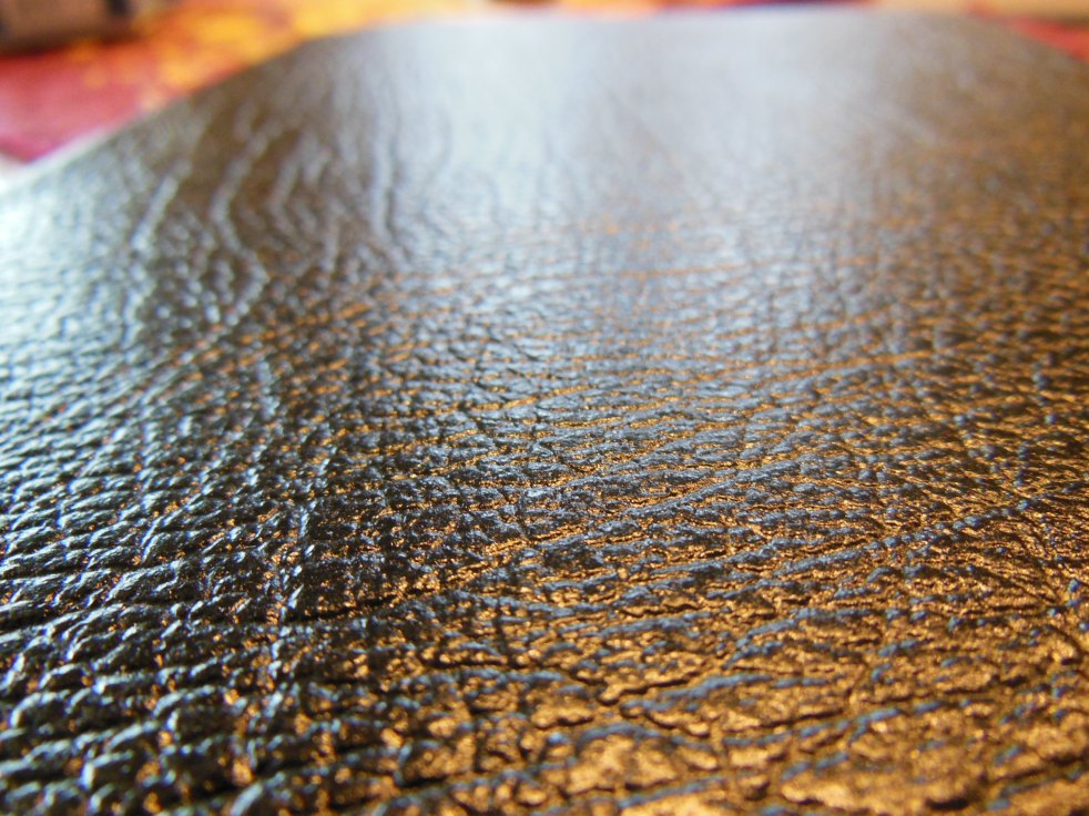 This Bible is case bound, and as such utilizes black vinyl covered paper as an interior liner and to join the cover to the text block.