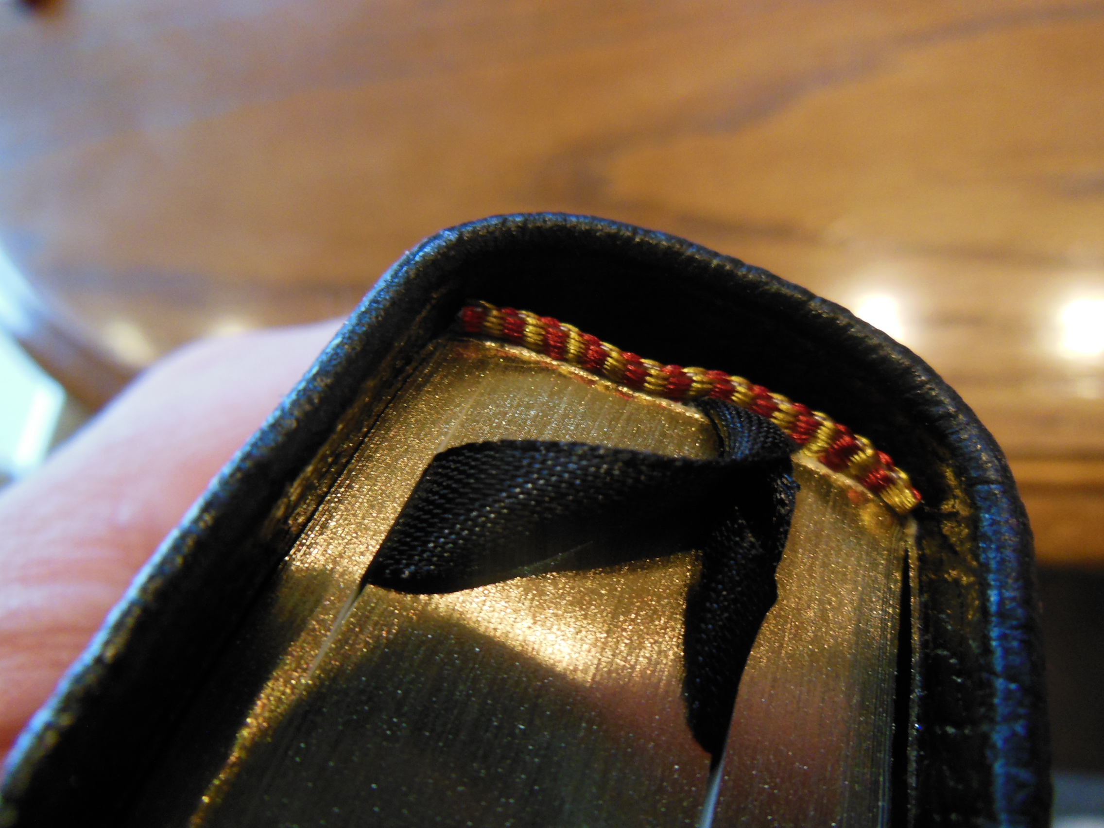 The front, inside, bottom edge has, “French Morocco Leather” in gold lettering stamped in it. Red and gold colored head and tail bands decorate this edition. It also includes two, black ribbon markers. The page edges are gold gilt. The corners and the spine are rounded. From the outside this Bible looks like what you’d expect a Bible to look like. It is a venerable style, and is very familiar.